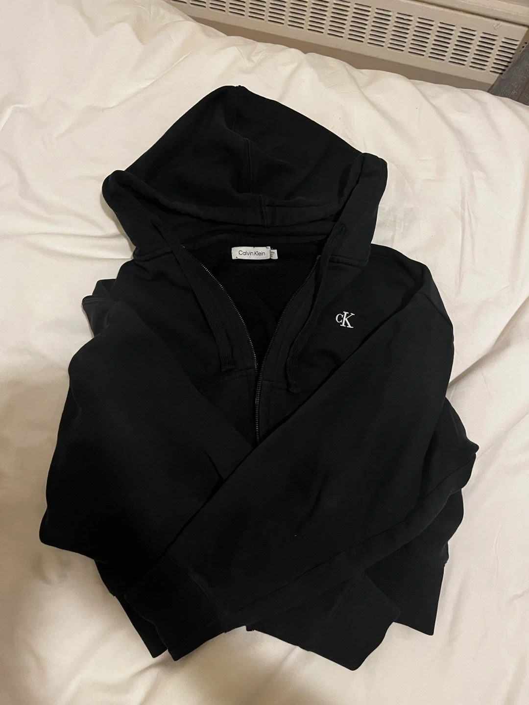 Selling a Calvin Klein black zip-up hoodie. It's in great condition and would be a great addition to any wardrobe! Size is XS but is kinda big so can fit size S as well