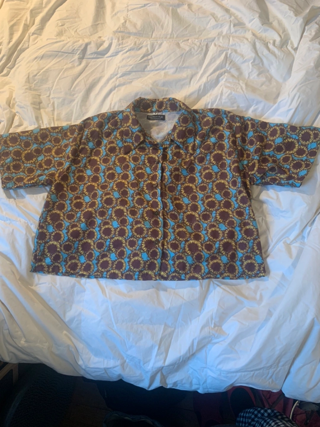 Short sleeved button up shirt with sunflower pattern, size M, no flaws