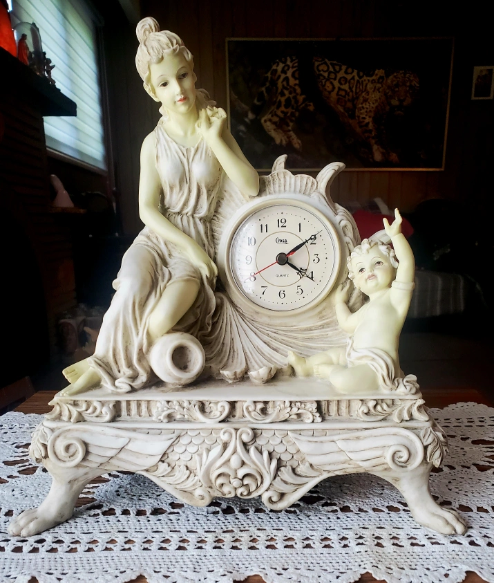 Here's a lovely Crosa Quartz clock featuring a figurine design! It would make a great addition to any room in great condition.