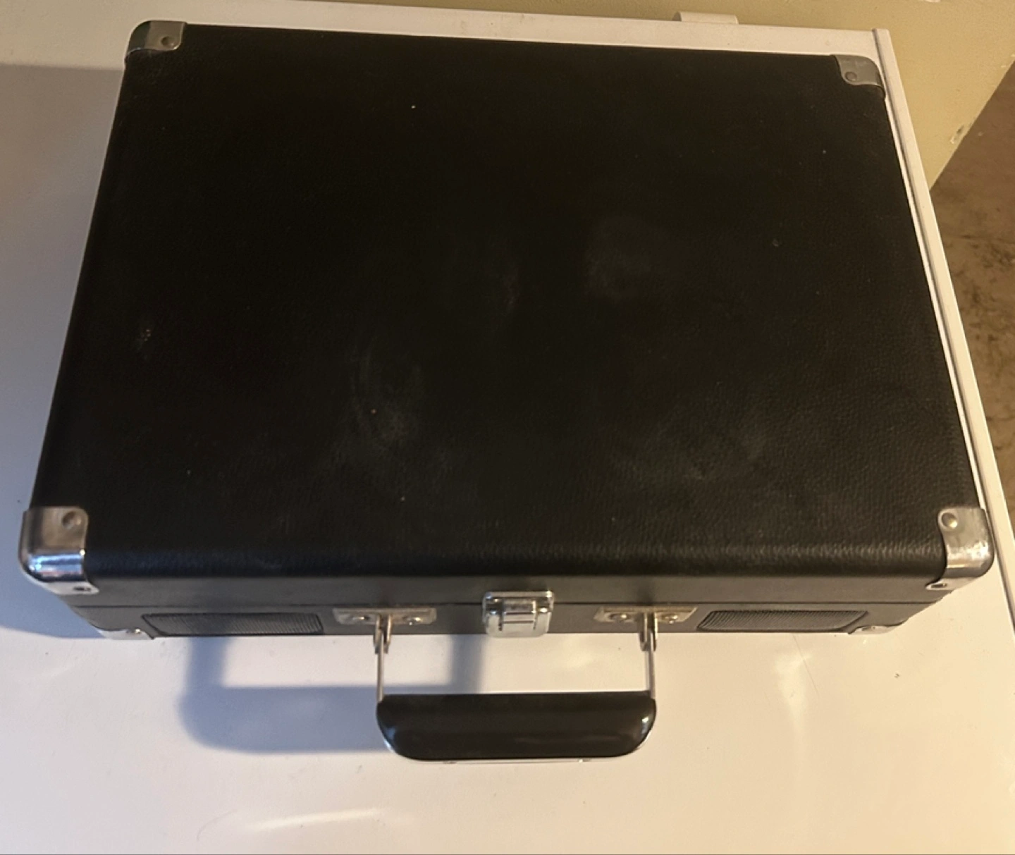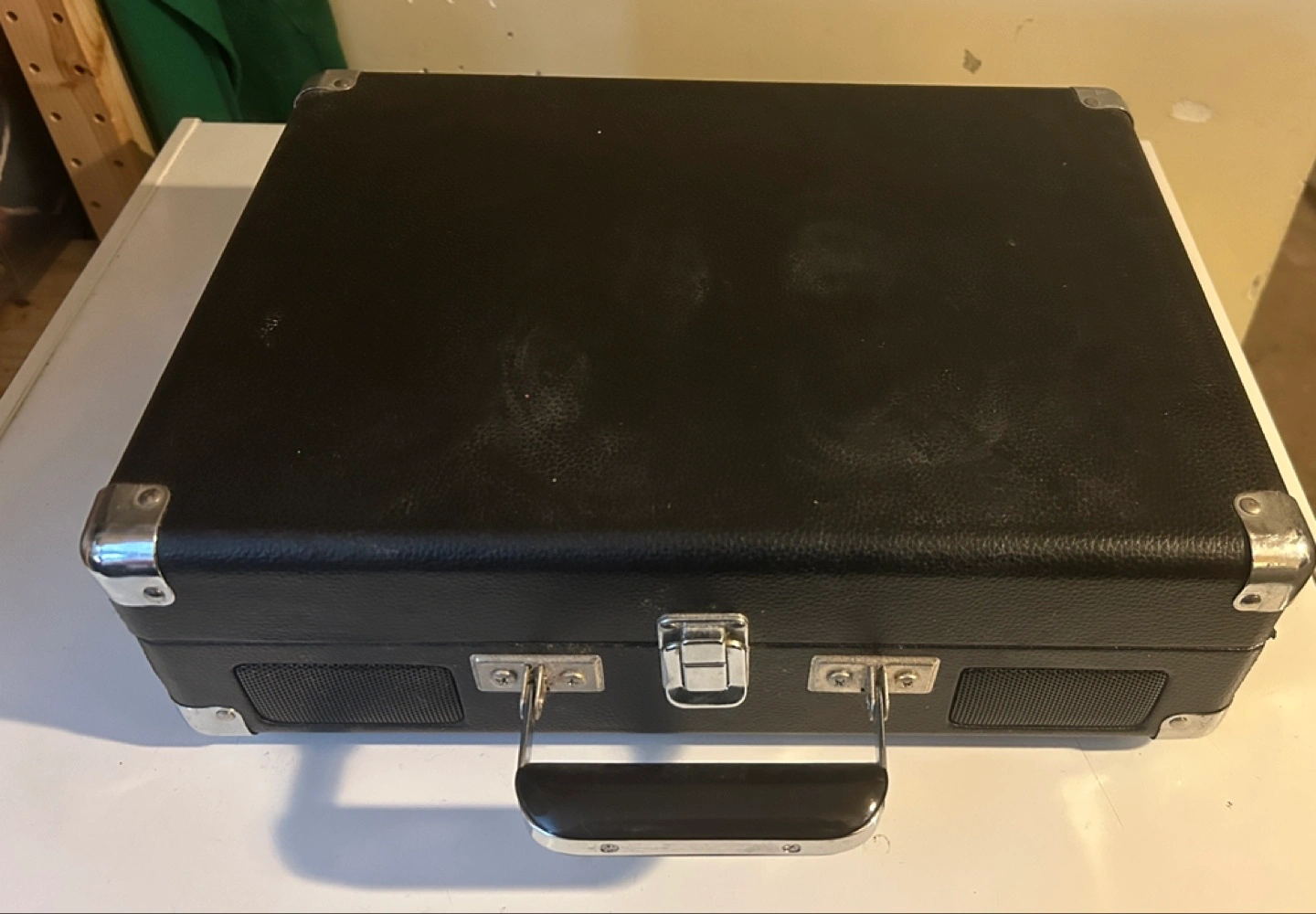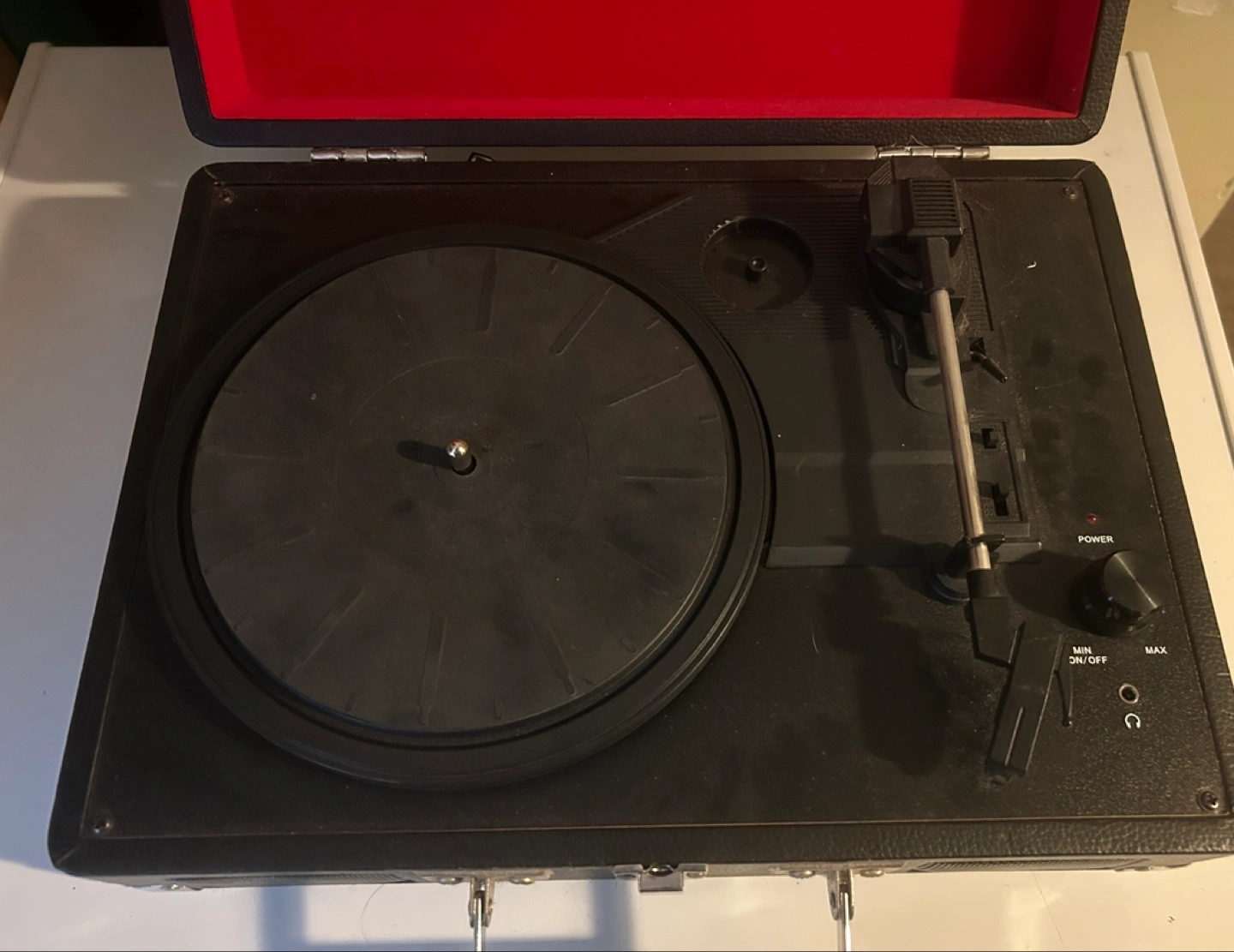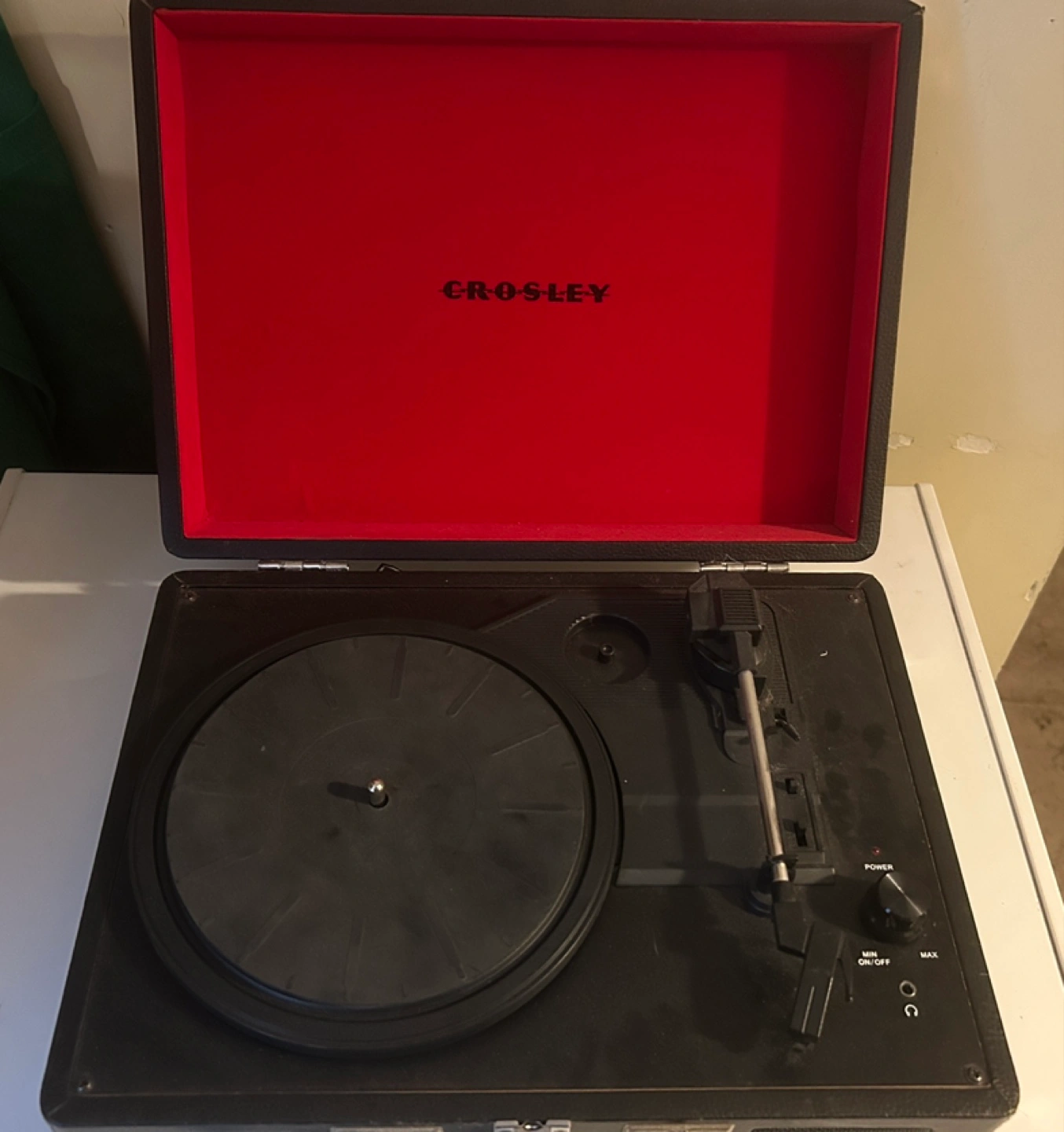 Crosley record player. Features a red interior with the Crosley brand name. The record player has a handle for easy carrying. AC adapter is missing.