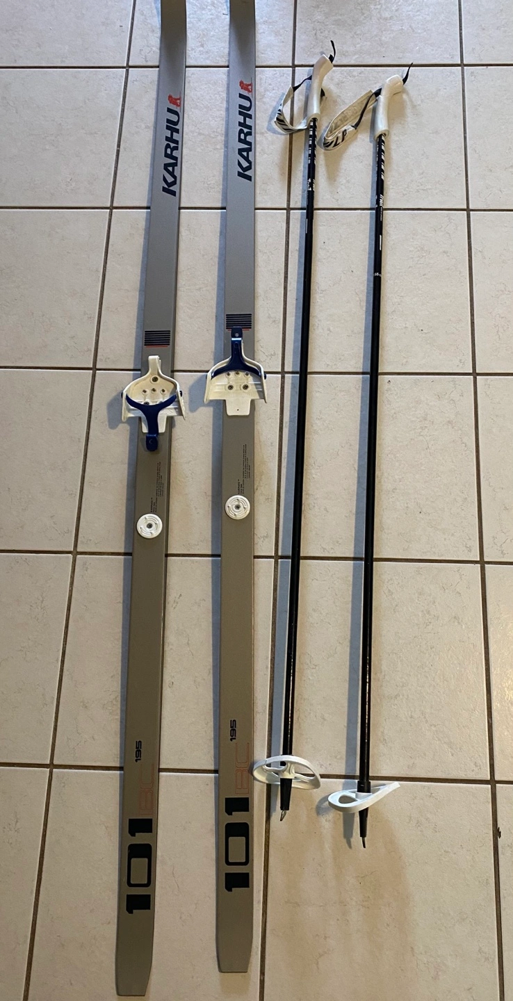 Karhu cross country skis 195 cm Poles 155 cm. Used like new. Pick up only. Text if interested 226-374-6926.
