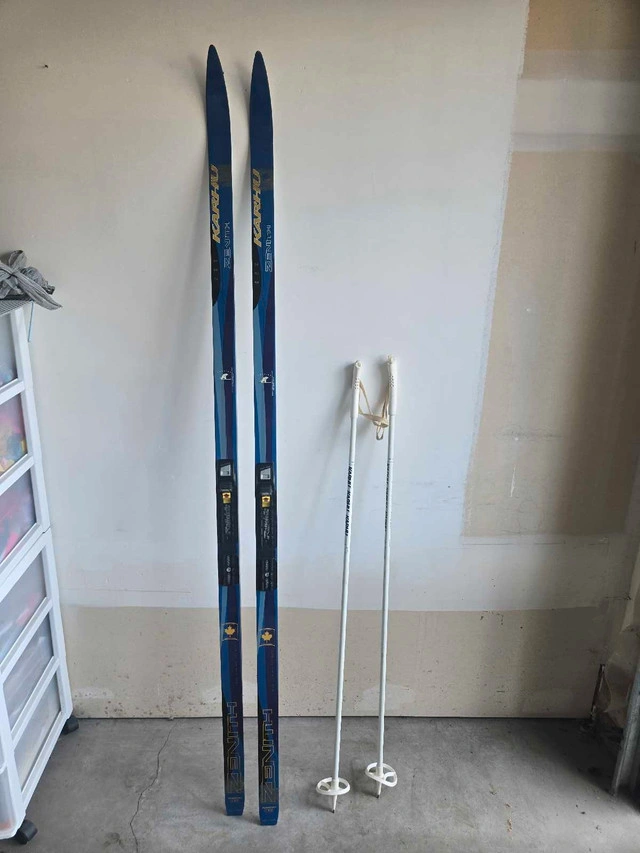 I'm selling a pair of Karhu Glide cross country skis and boots, perfect for striding through snowy trails, complete with poles! These skis are used but in good condition, ready for your next winter adventure. They measure 210cm. * Brand: Karhu * Model: Glide * Length: 210 cm * boots size 41 I've priced them fairly. Happy skiing!