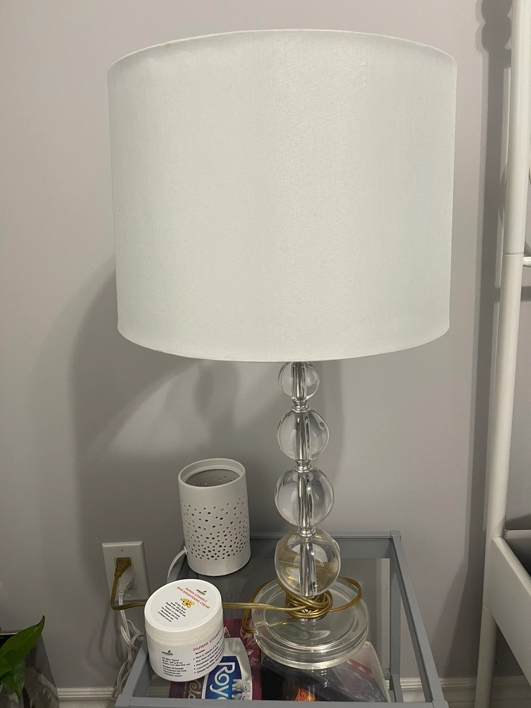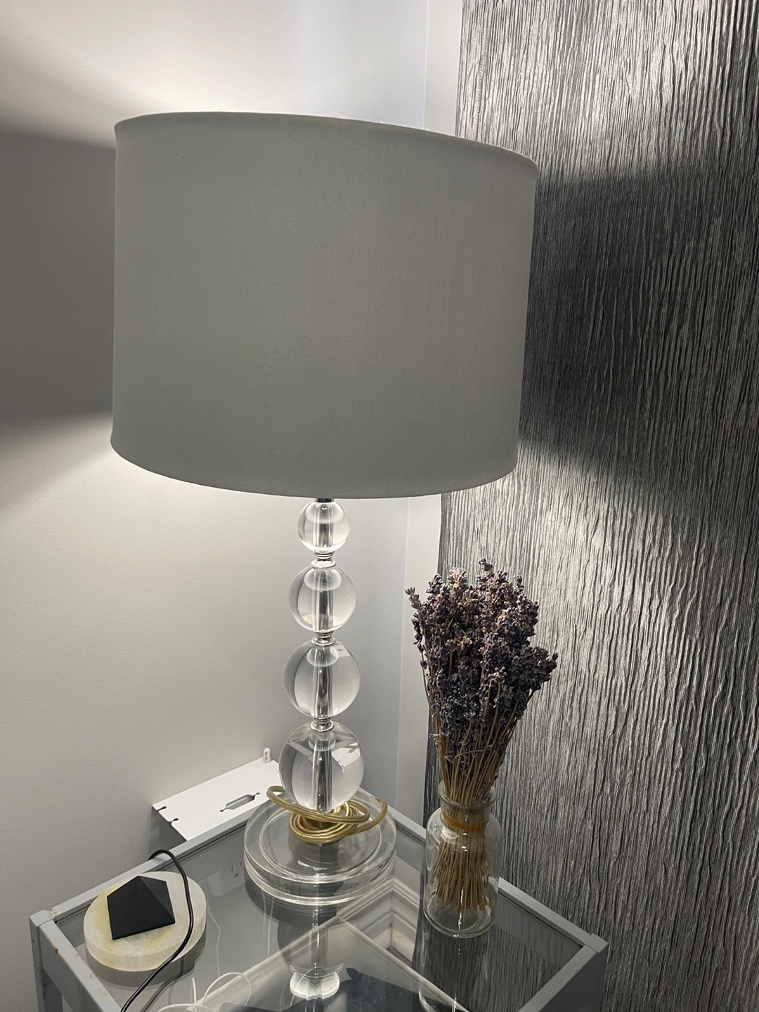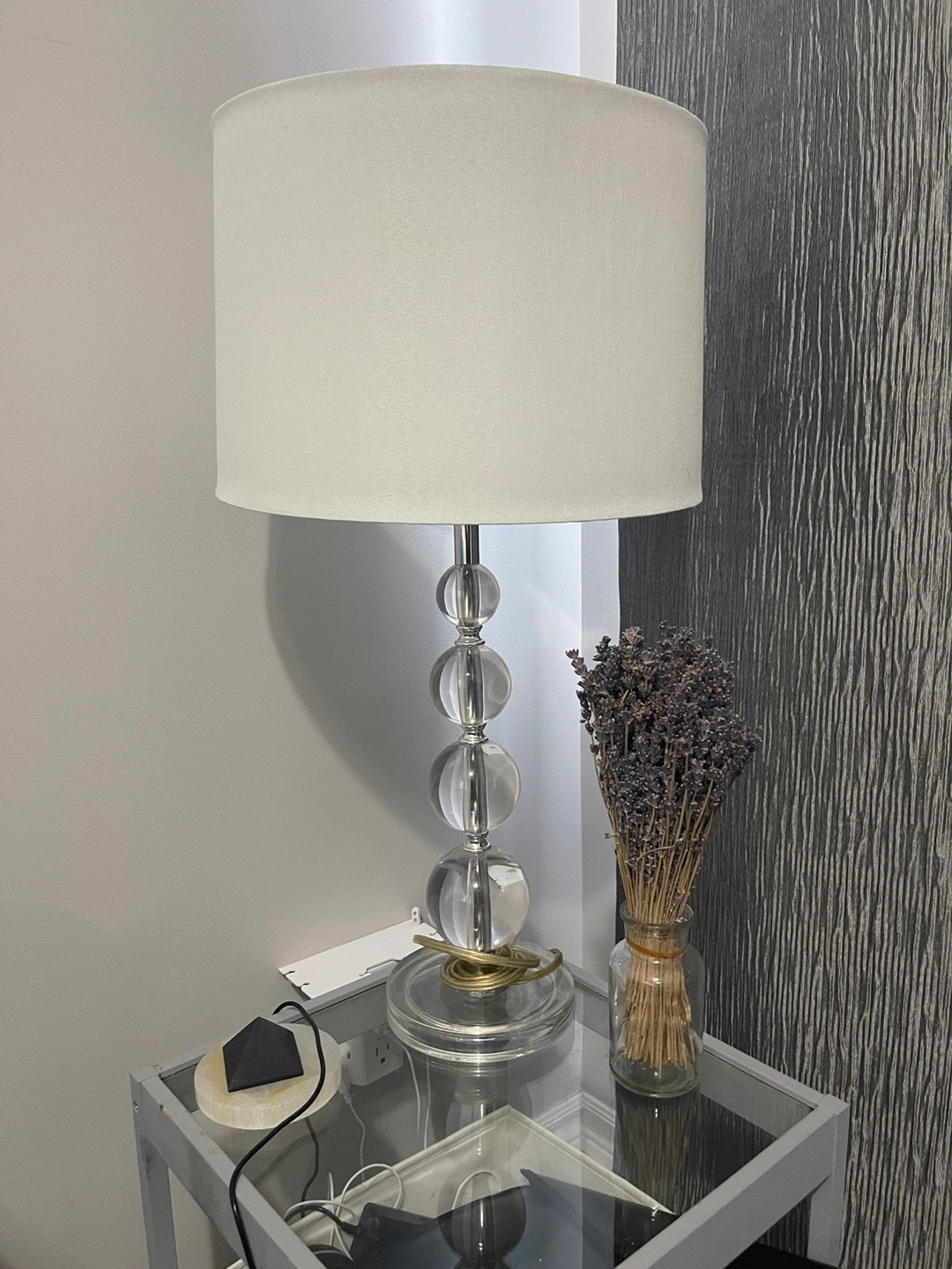 Table lamps with a crystal ball base and a white drum shade. Great condition.