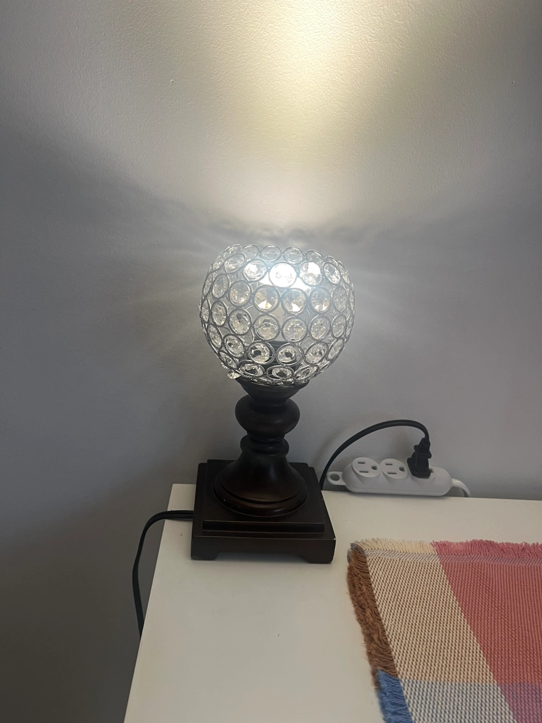 Selling a beautiful crystal ball table lamp! It adds a touch of elegance to any room. The lamp features a sphere of clear crystals on a dark wooden base. It's in great condition and ready to brighten up your space