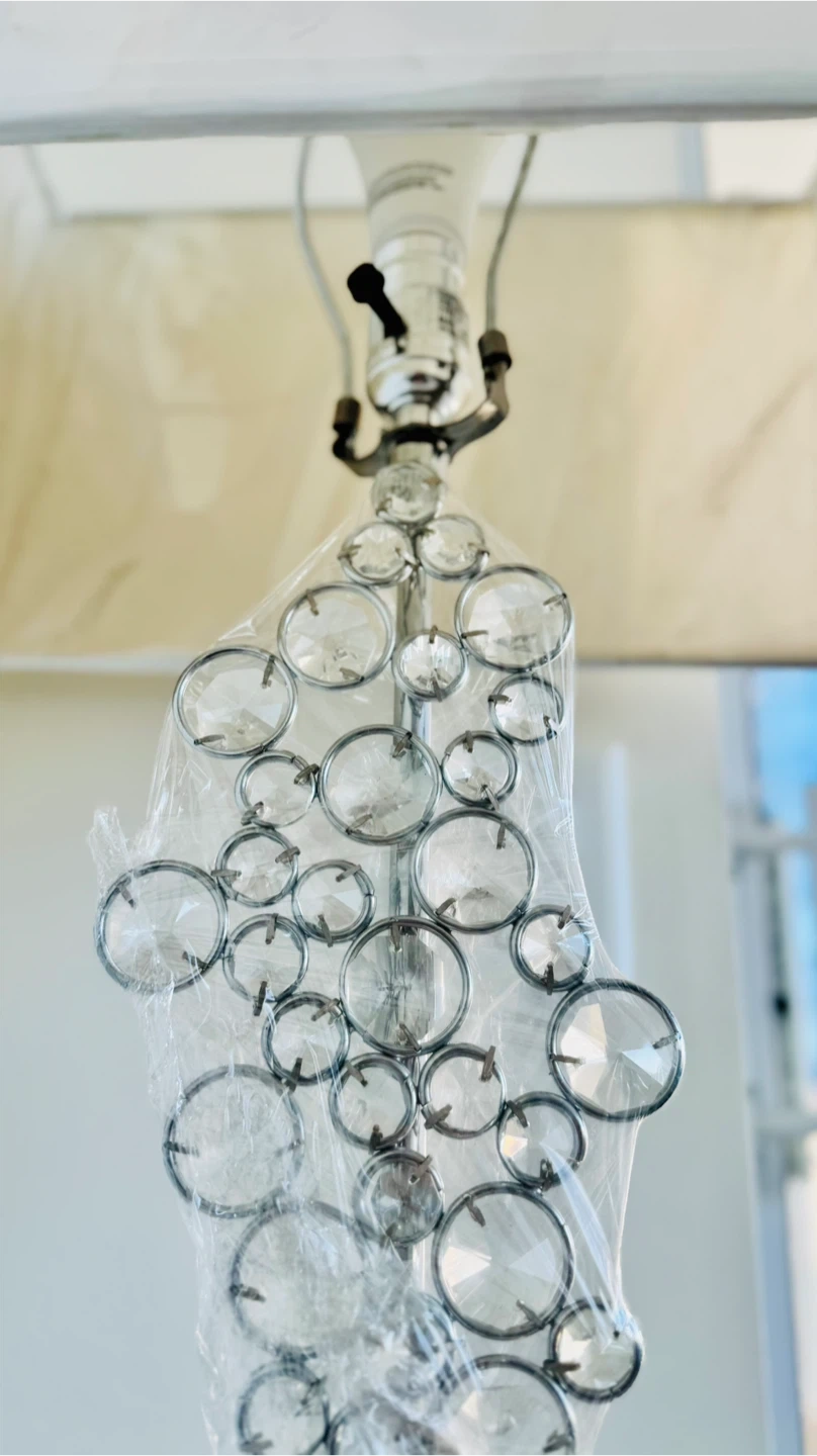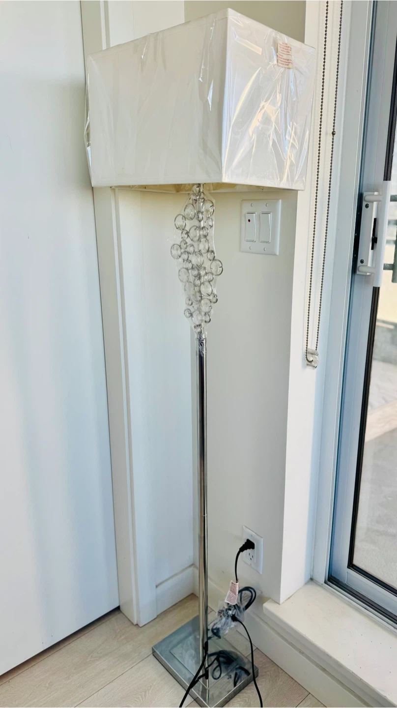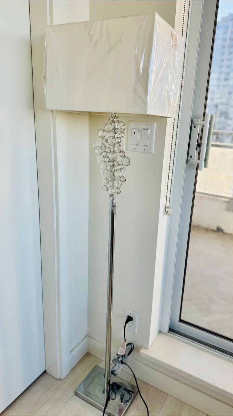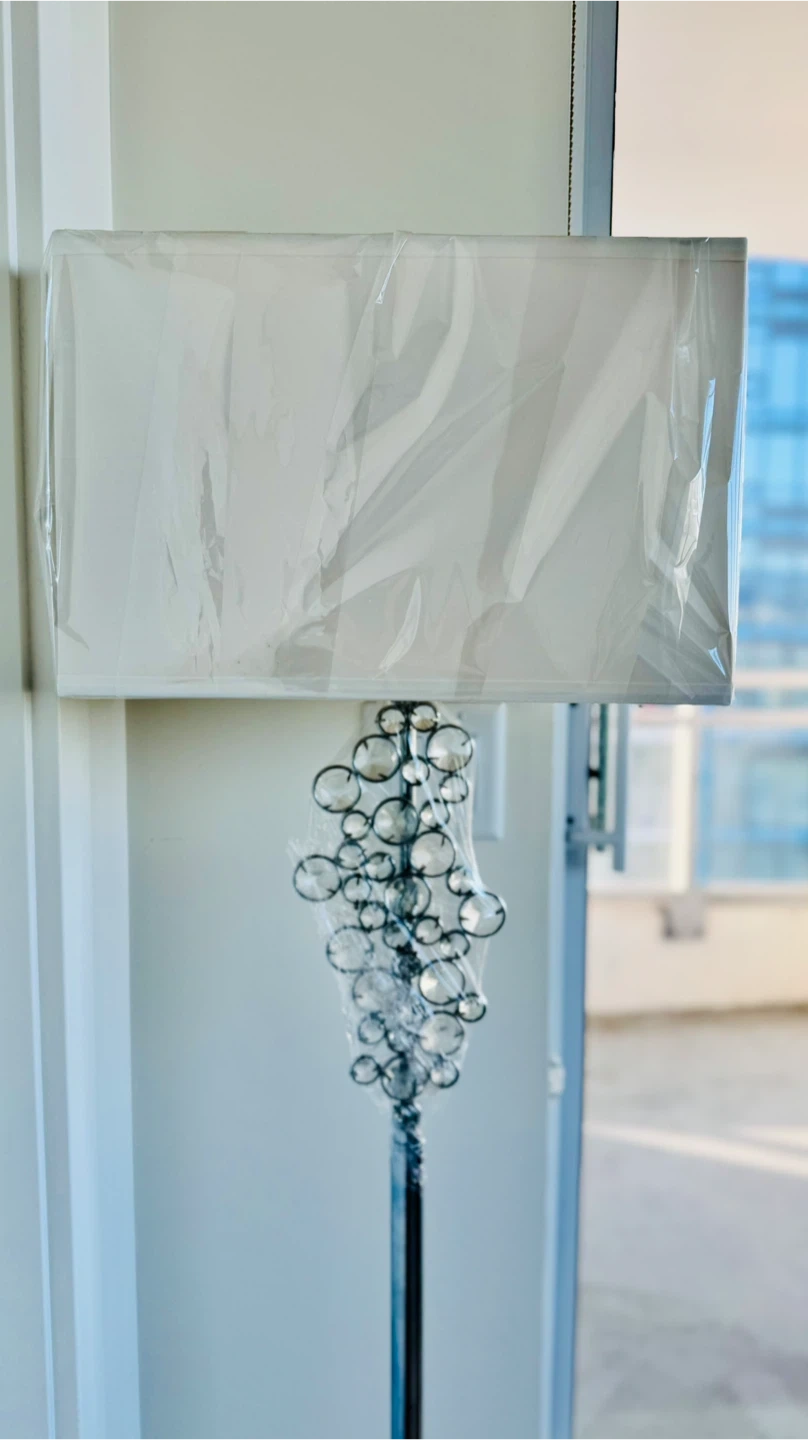 Moving Sell Selling a beautiful crystal bubble floor lamp! It's in like-new condition and comes with a square white lampshade. The base and stand are a sleek silver colour. It will add a touch of elegance to any room! From Pet and smoke free home Pickup Surrey Central