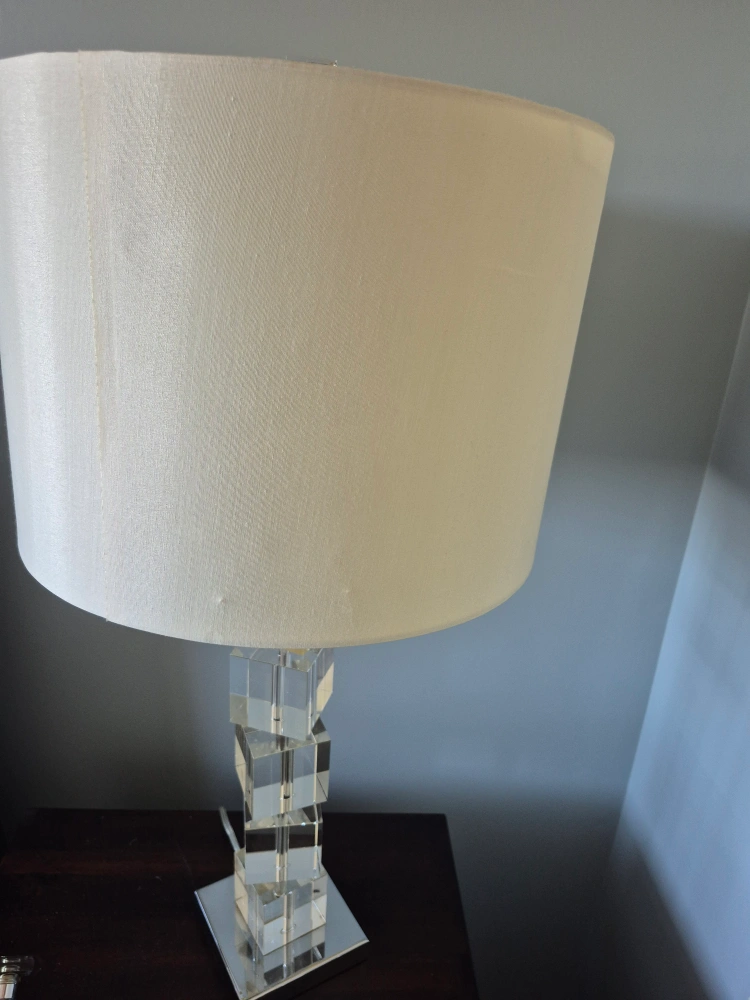 Here's a lovely crystal cube table lamp that would add a touch of elegance to any room! It features a stylish crystal cube base and a classic white shade. It's in great condition and ready to brighten up your space