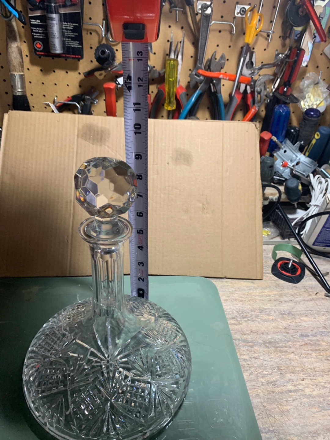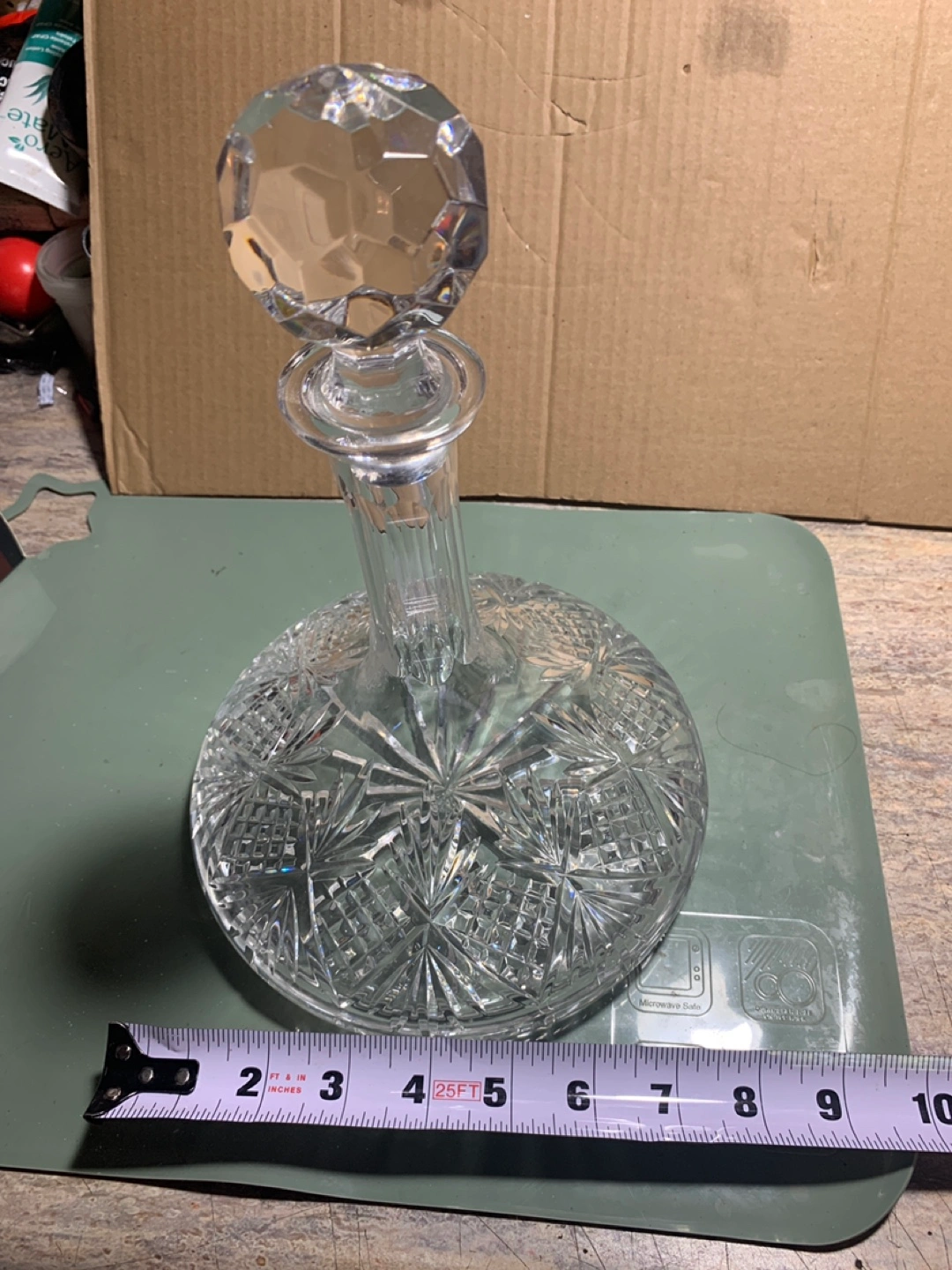Elegant crystal decanter. Round base with patterned cuts. Faceted crystal stopper. Such an item creates a peaceful mood in any room.