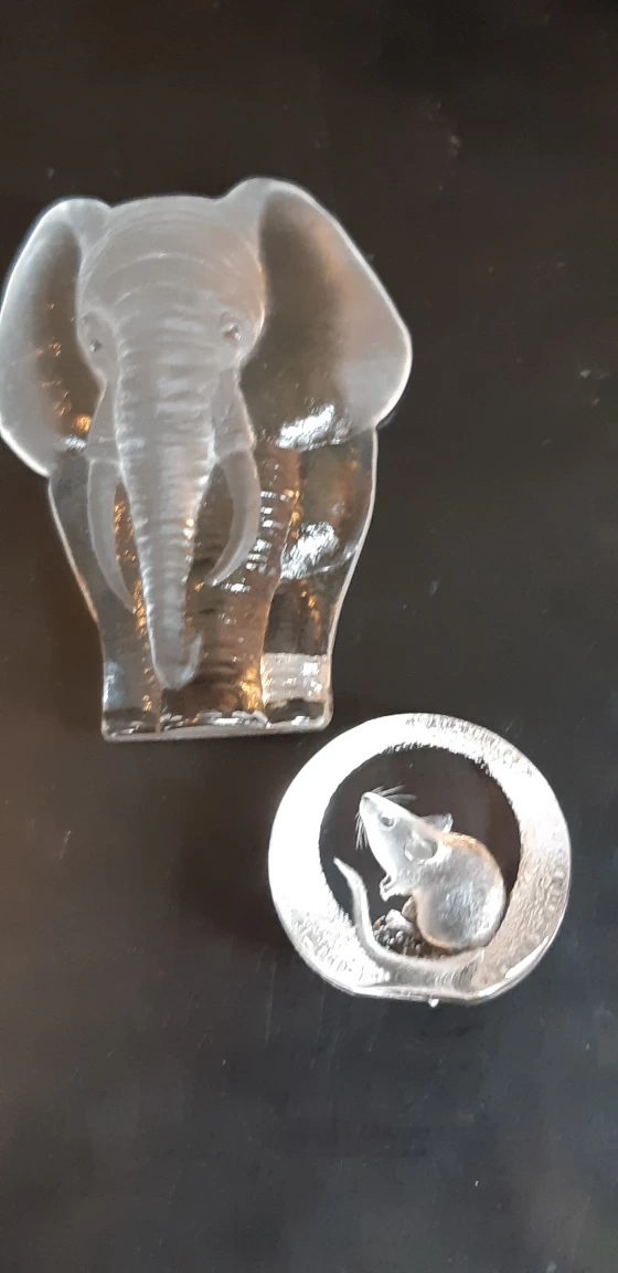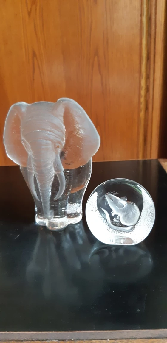 2 lovely crystal paperweights from Sweden Both are signed by Mats Jonasson. One is an elephant and the other is a mouse. Both are in great condition and would look great in any home!