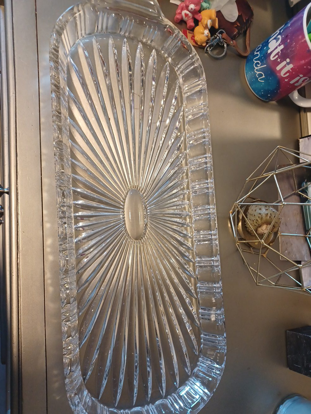 Selling a lovely crystal glass serving tray. It features a beautiful sunburst pattern and a rectangular shape. Perfect for serving appetizers or desserts at your next gathering!