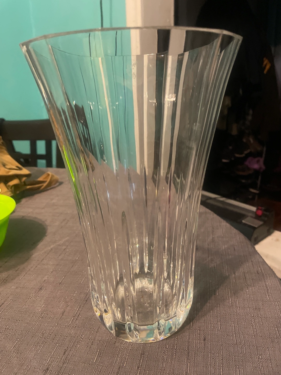 Tall glass vase with a flared top. Clear and has vertical lines.