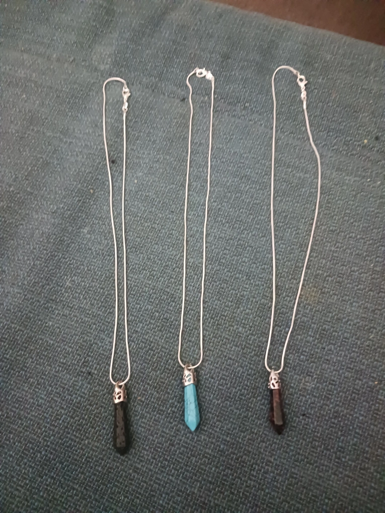 Selling Crystal point pendants. They come with silver-tone chains. The crystals are black, turquoise and brown amethyst. Perfect for adding a touch of earthy elegance to your style!