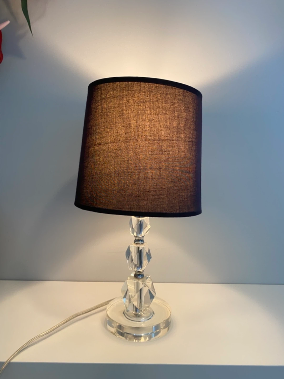 Selling a beautiful crystal table lamp! It has a sleek black shade and a clear crystal base and stem. It would look great in any room as a stylish accent piece