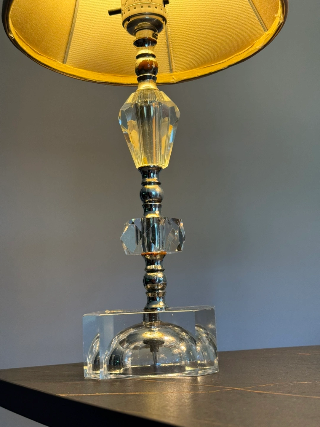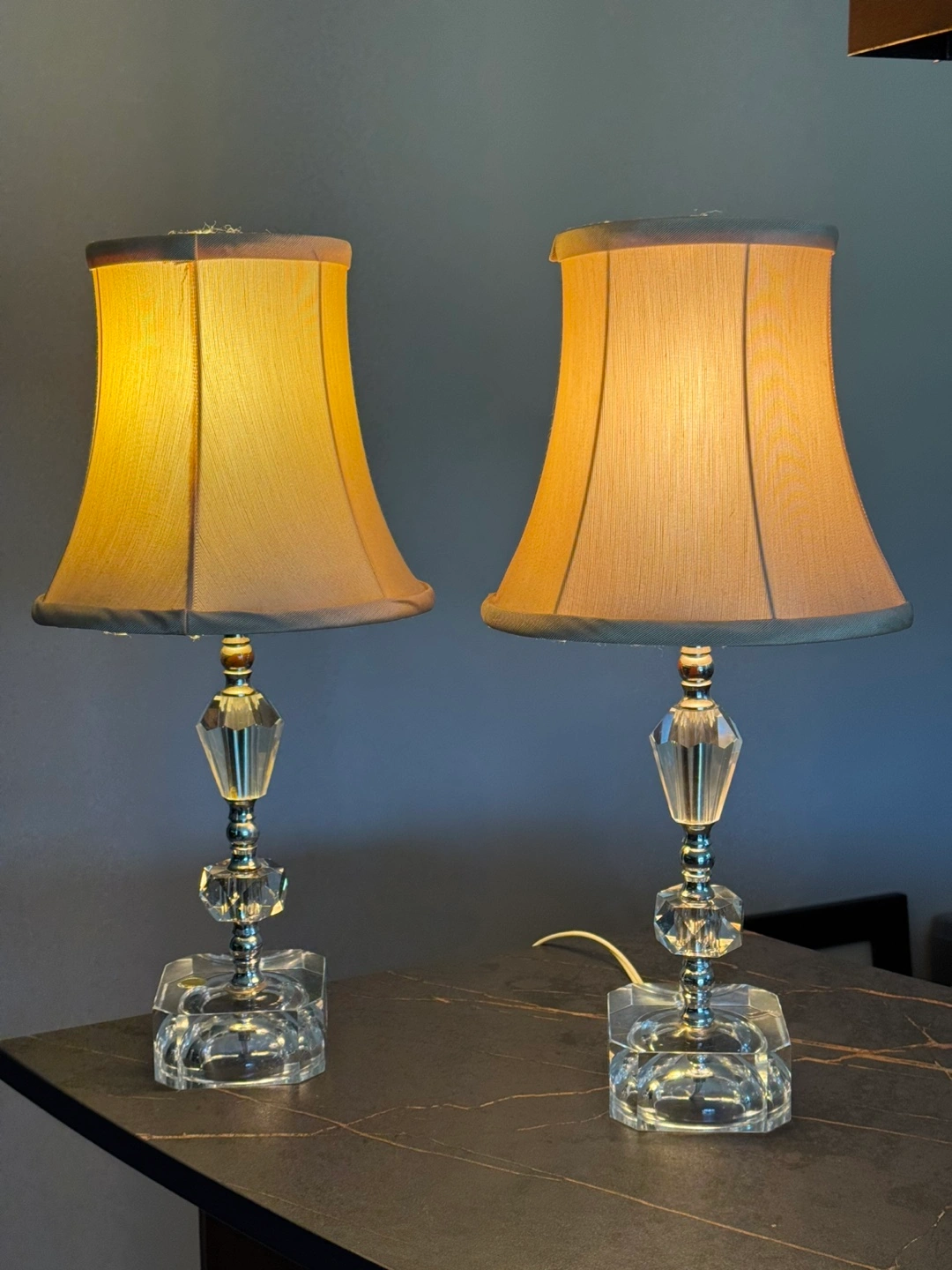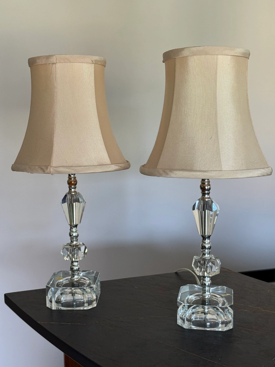 Selling a set of two elegant crystal table lamps. They have a classic design that would look great in any room. The lamps feature a crystal base and a neutral-toned shade. They're in great condition and ready to brighten up your space! Note that some chrome pieces are showing wear (see photos) and these take normal e26 base light bulbs (included!) Pick up only and cash preferred