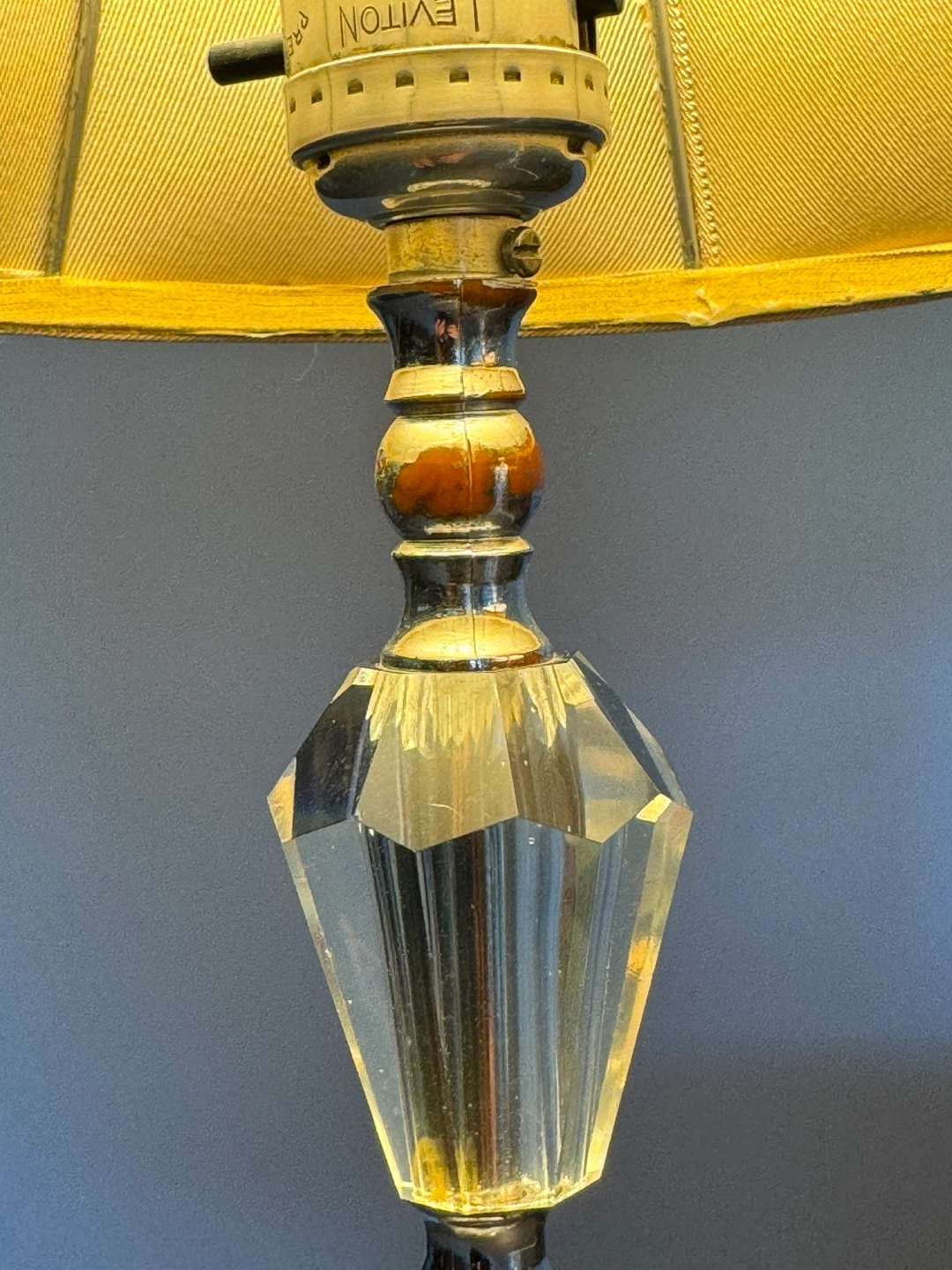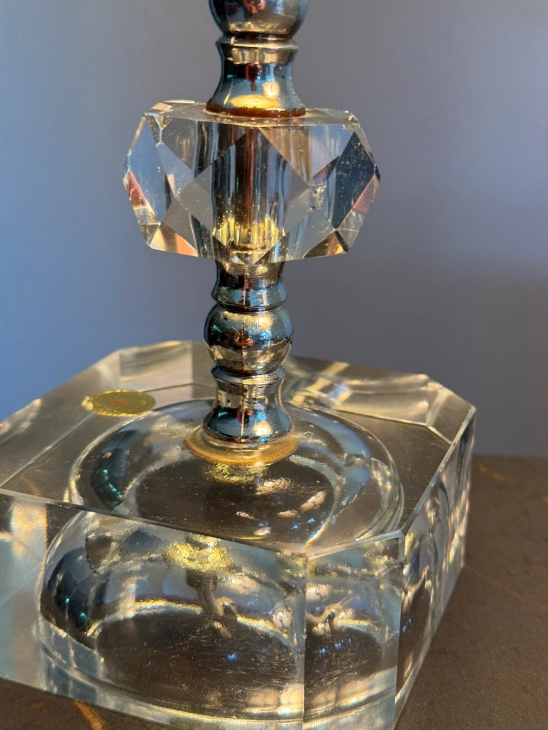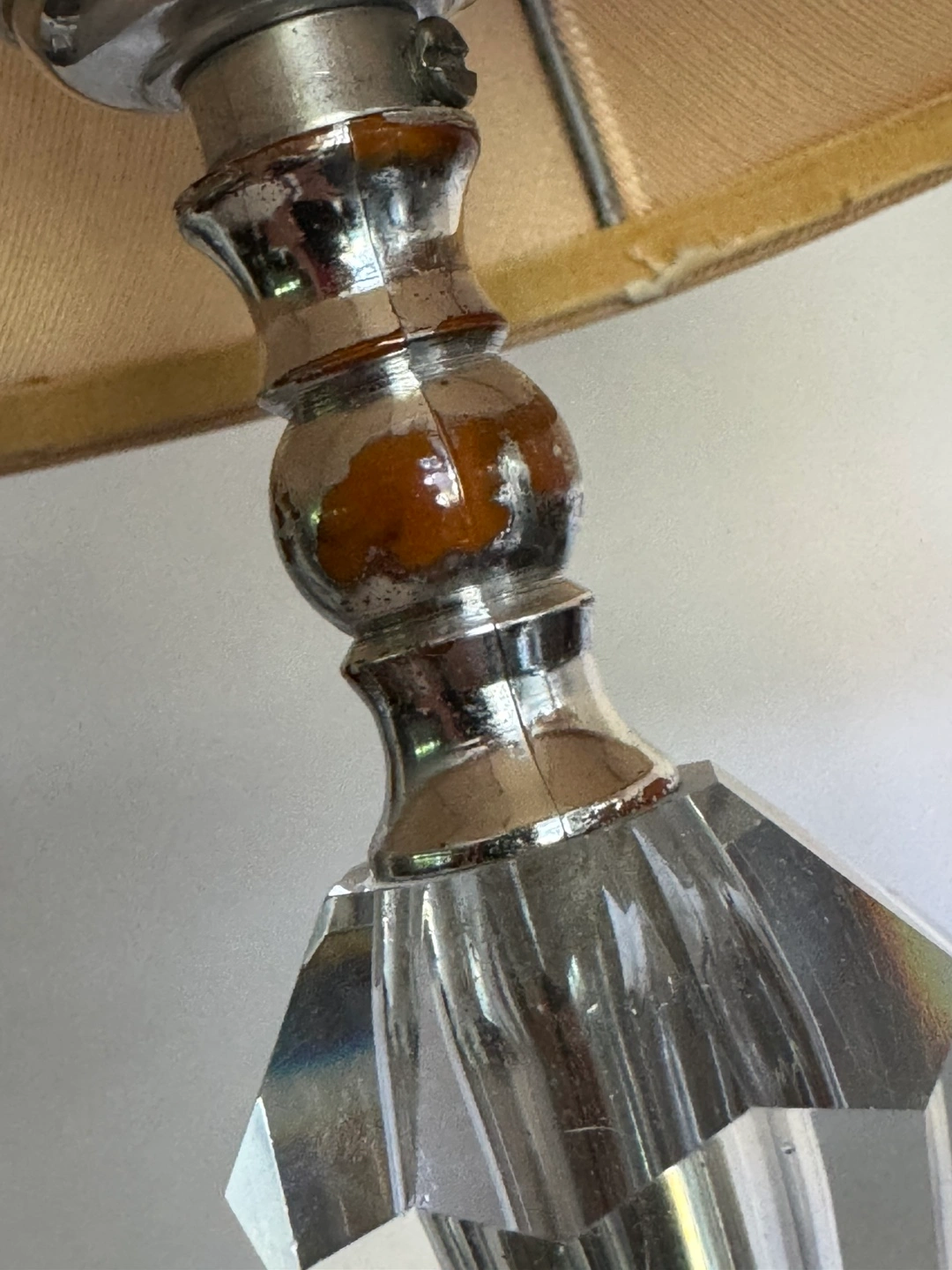 Selling a set of two elegant crystal table lamps. They have a classic design that would look great in any room. The lamps feature a crystal base and a neutral-toned shade. They're in great condition and ready to brighten up your space! Note that some chrome pieces are showing wear (see photos) and these take normal e26 base light bulbs (included!) Pick up only and cash preferred