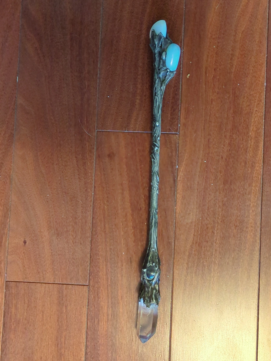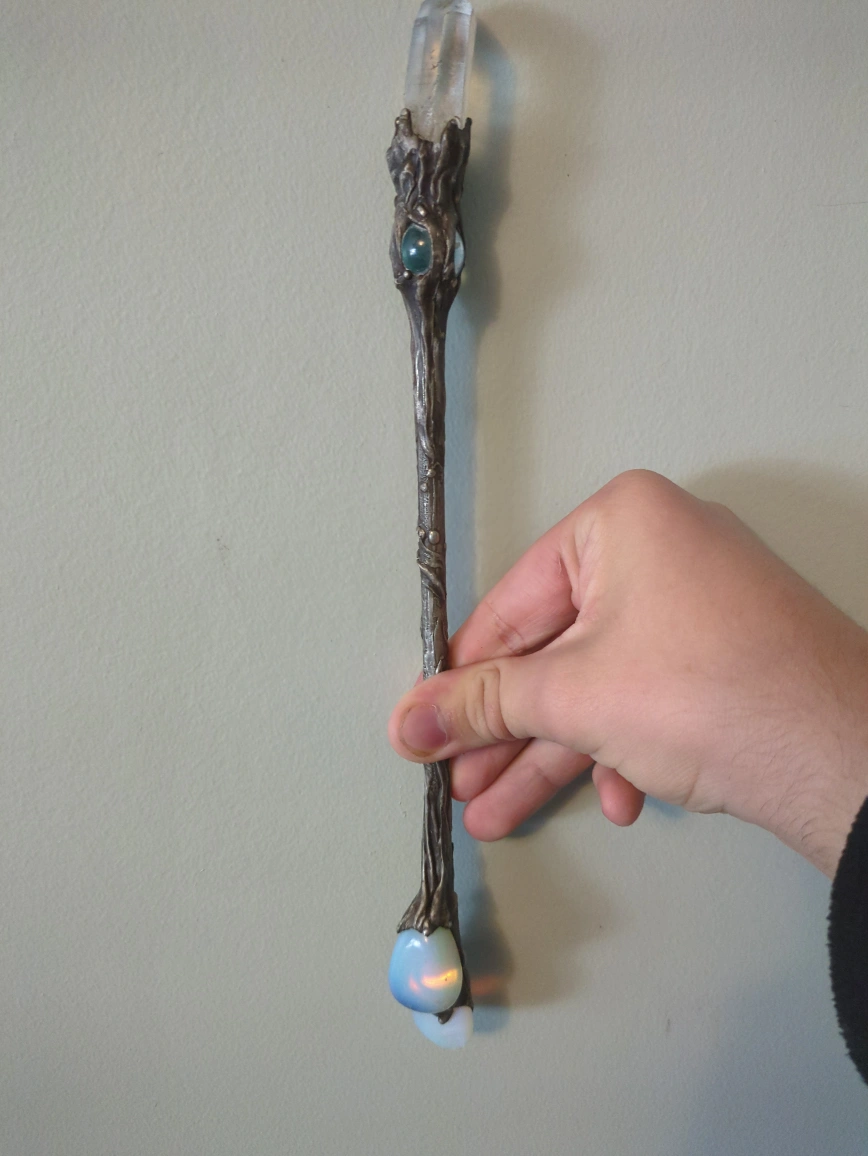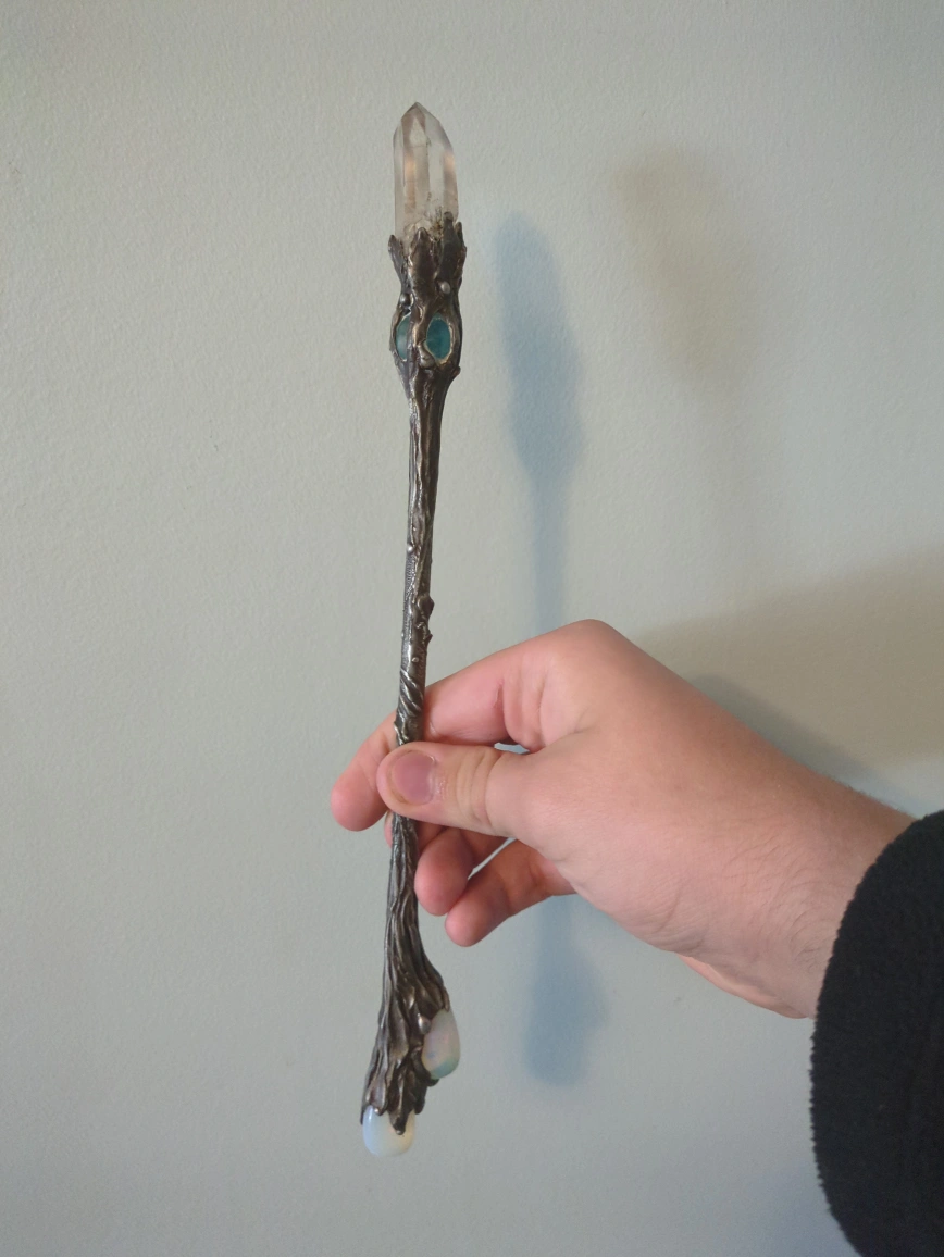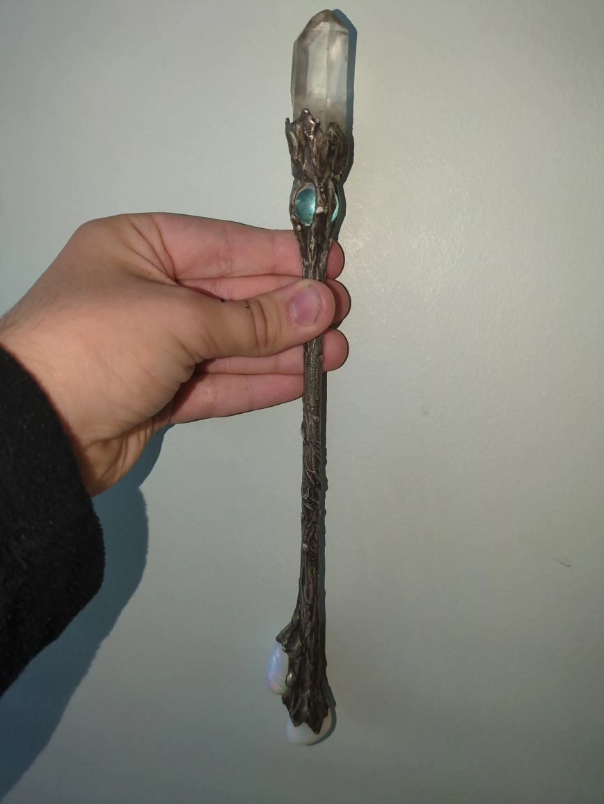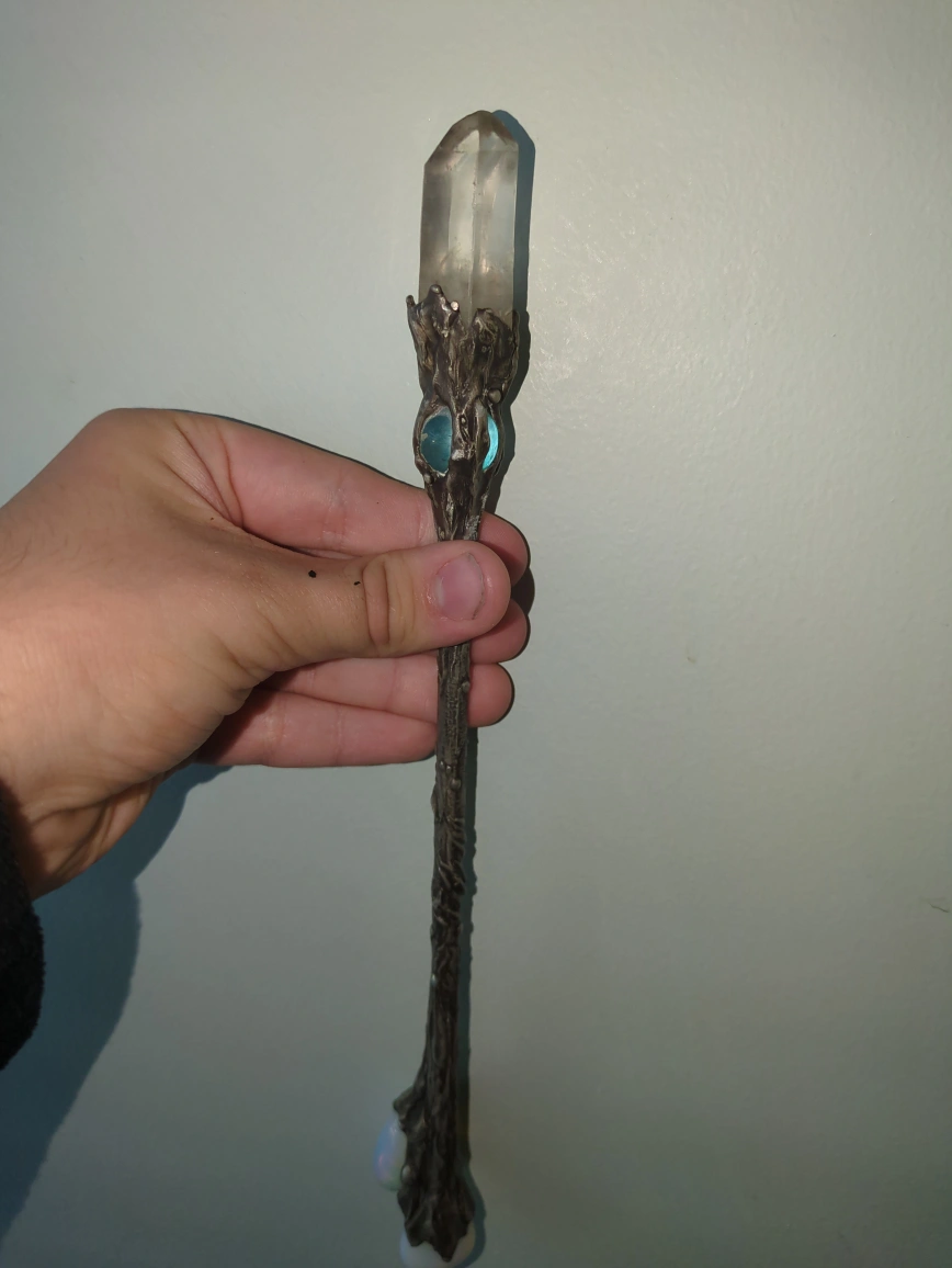Beautiful crystal wand featuring clear quartz at the top, a blue-green glass ball in the middle, and opalescent stones at the base. The wand has an ornate, tree-like design made of a dark metal. It's in great condition and would be perfect for anyone interested in Wiccan practices or as a decorative piece! really solid and well-made. Bought it a few years ago for $300, but I’m letting it go because I’m saving up for something else. It’s in great condition and looks stunning in the light. Perfect for crystal collectors, energy work, or just as a display piece.