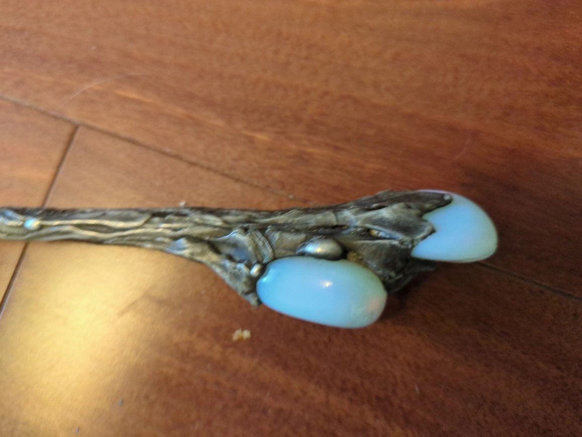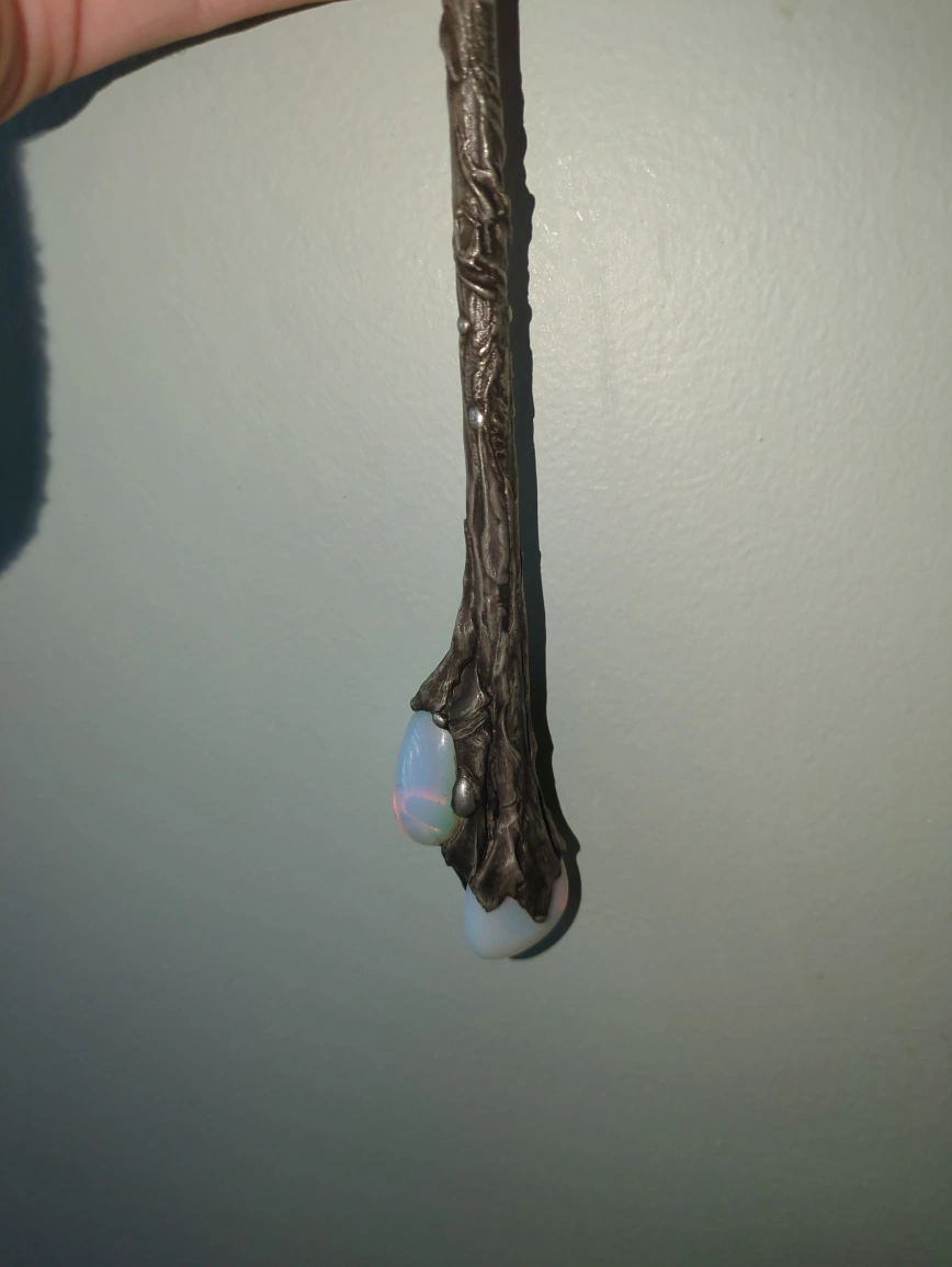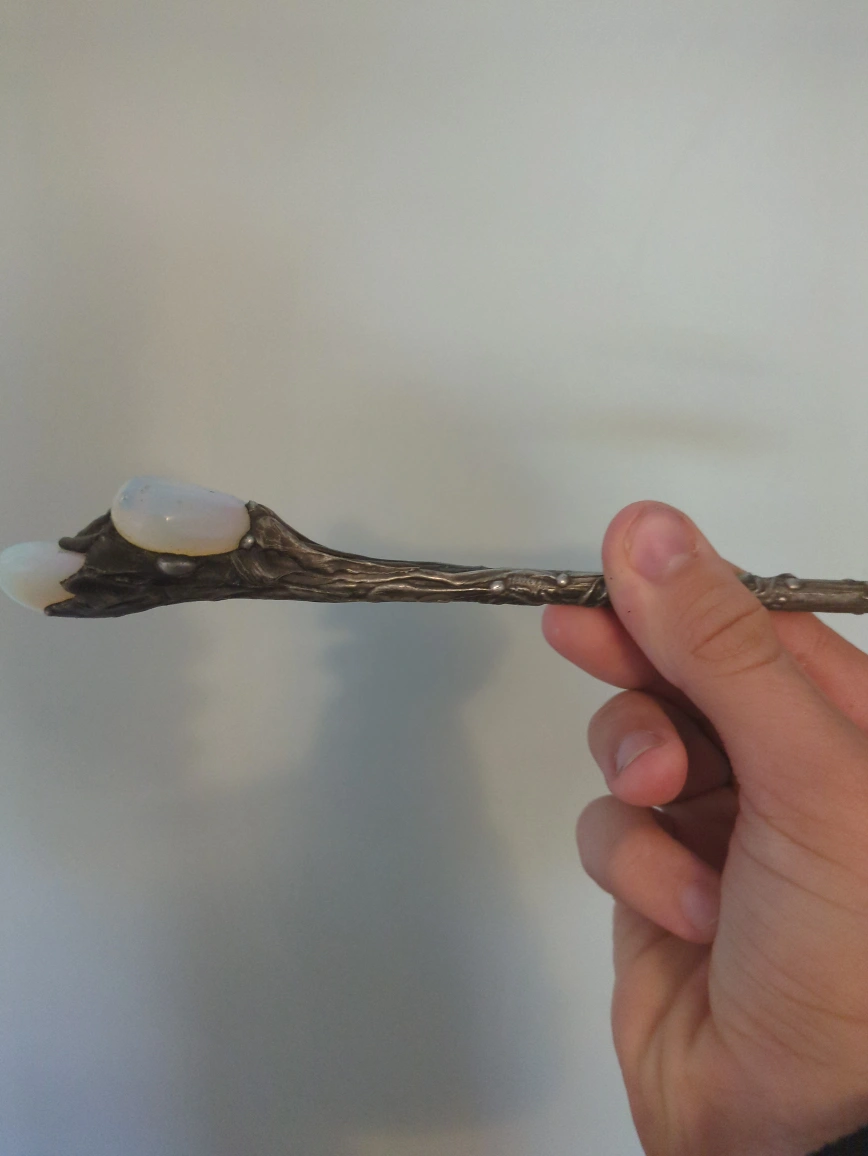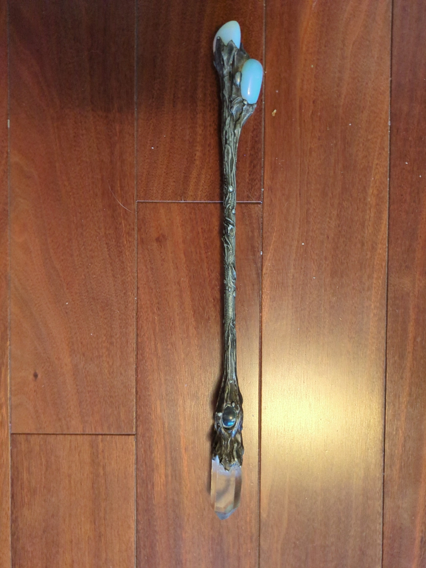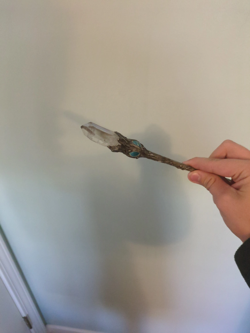 Beautiful crystal wand featuring clear quartz at the top, a blue-green glass ball in the middle, and opalescent stones at the base. The wand has an ornate, tree-like design made of a dark metal. It's in great condition and would be perfect for anyone interested in Wiccan practices or as a decorative piece! really solid and well-made. Bought it a few years ago for $300, but I’m letting it go because I’m saving up for something else. It’s in great condition and looks stunning in the light. Perfect for crystal collectors, energy work, or just as a display piece.