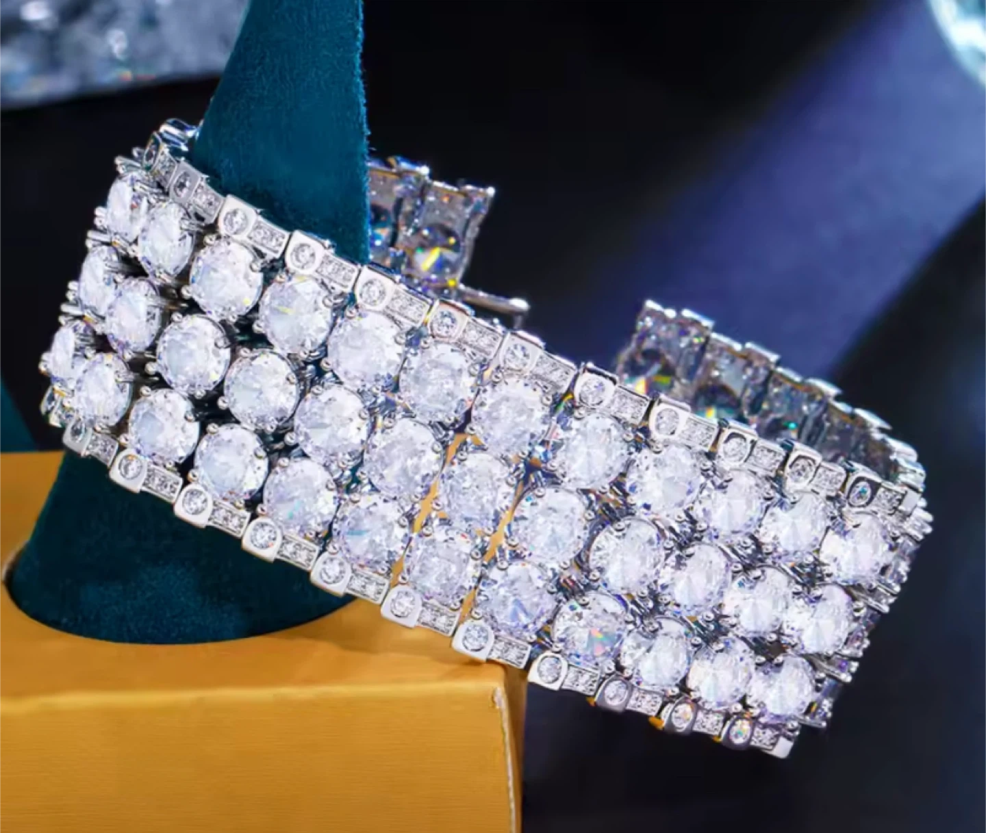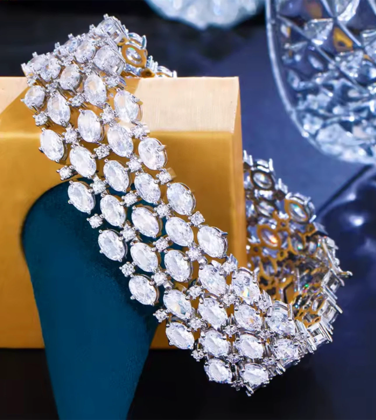Price for each item. Gorgeous cubic zirconia pave bracelet with a diamond-like perfect cut! It features a safety clasp. The bracelet is 18cm in length and 2cm wide. There is also a 2cm free extension for a bigger size