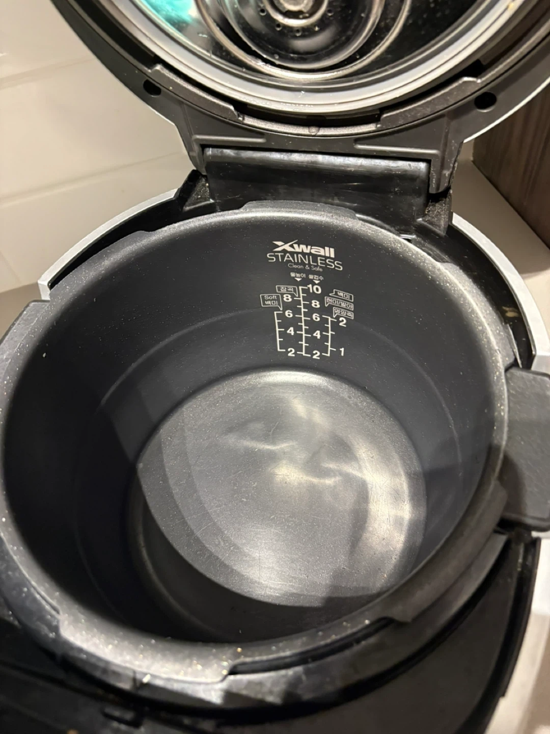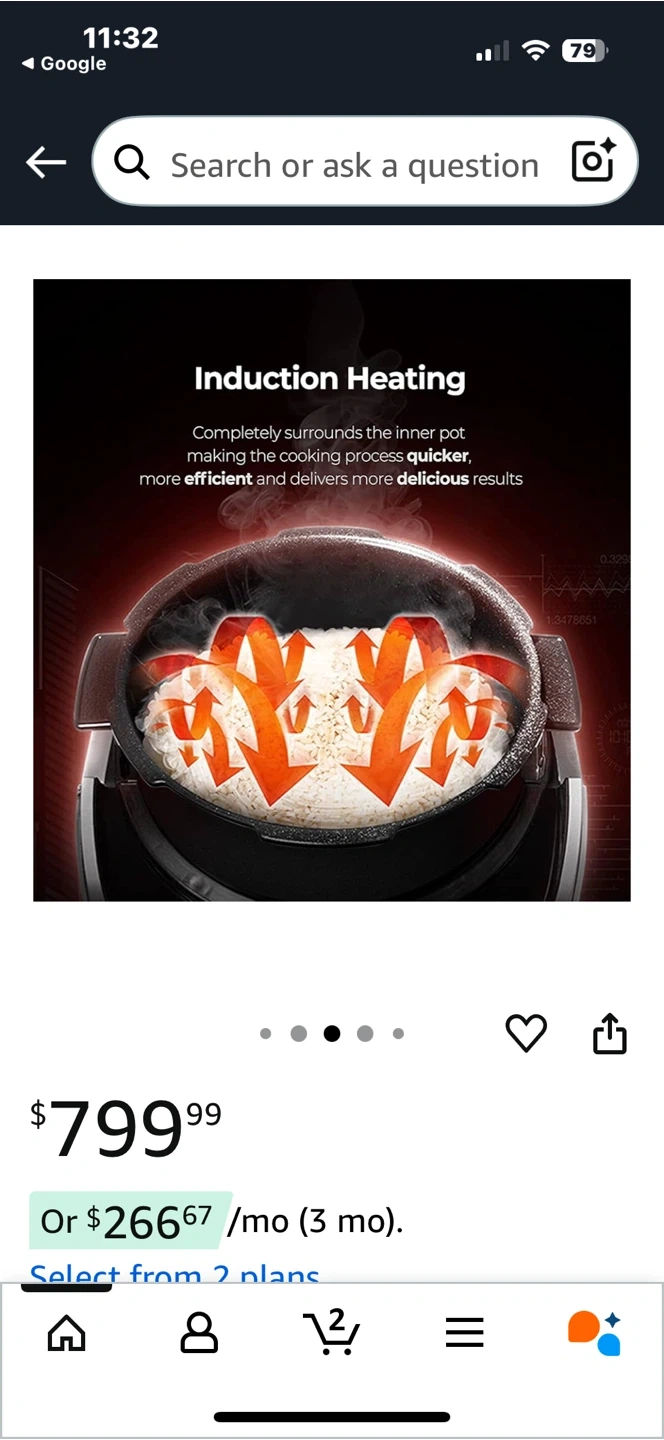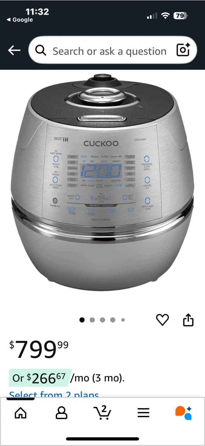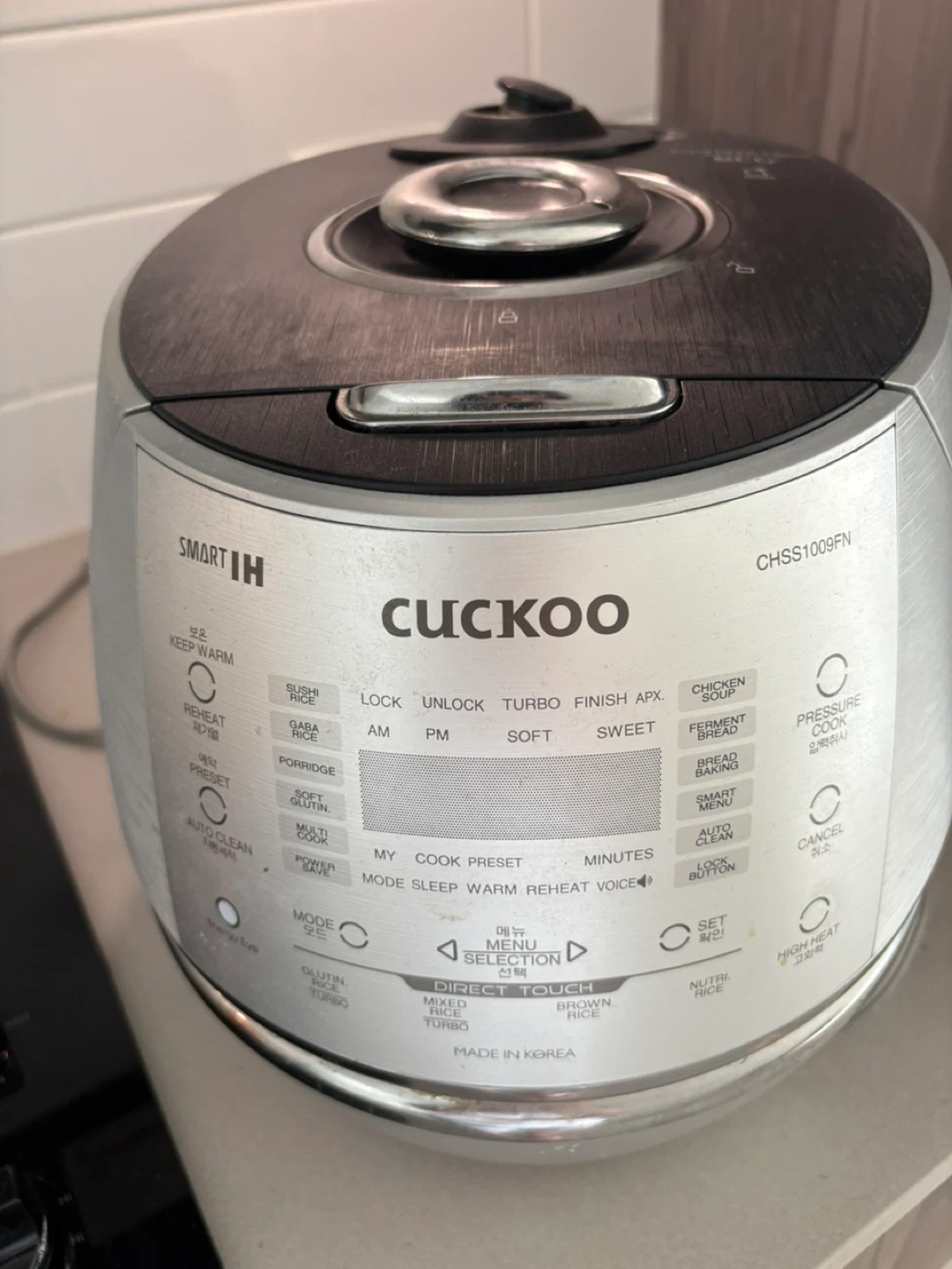Selling a Cuckoo CHSS1009FN Smart IH rice cooker! It has a stainless steel inner pot with markings for measuring rice and water levels. The original listing shows it retails for $799.99. It uses induction heating for quicker and more efficient cooking 10cup