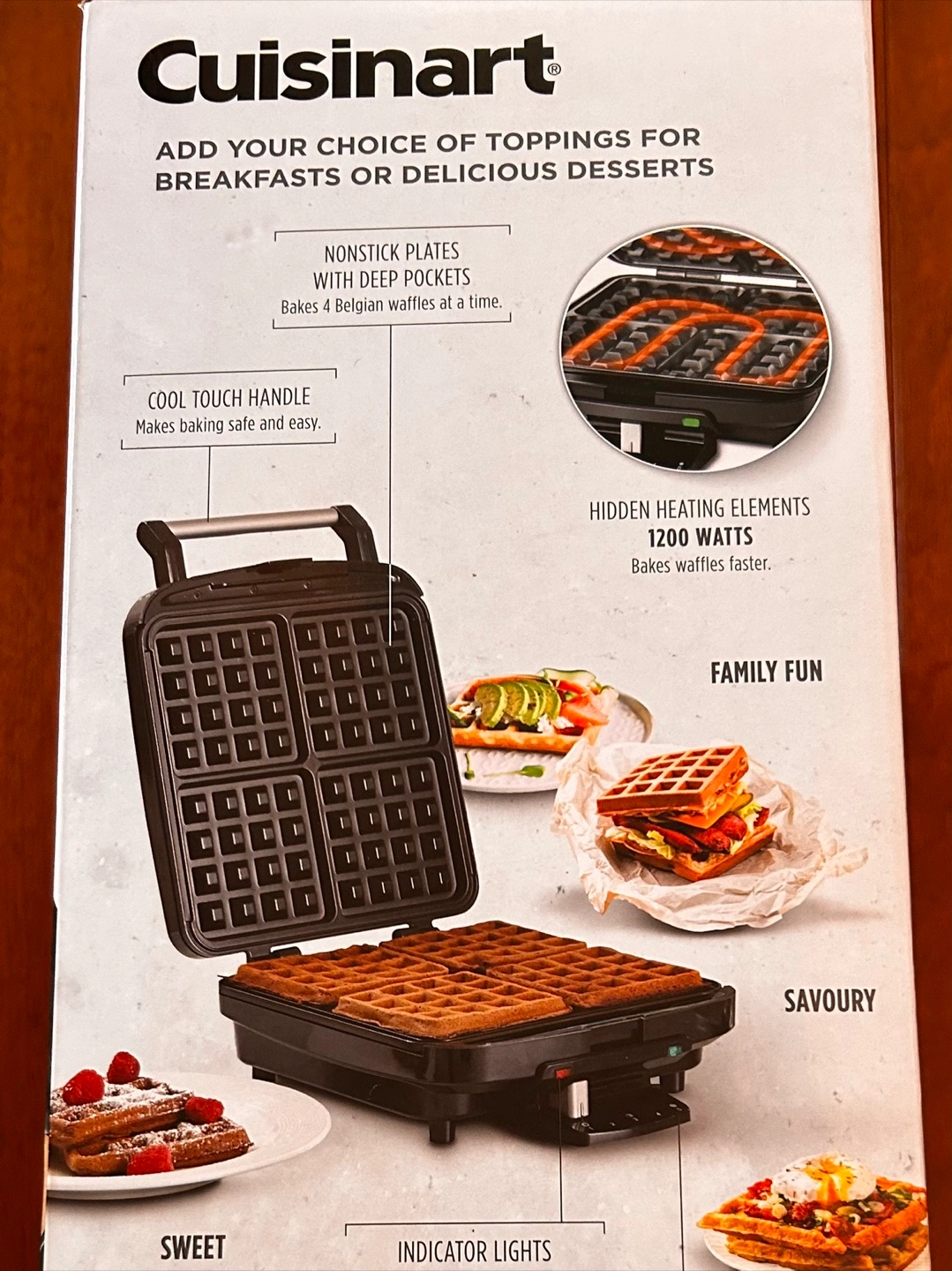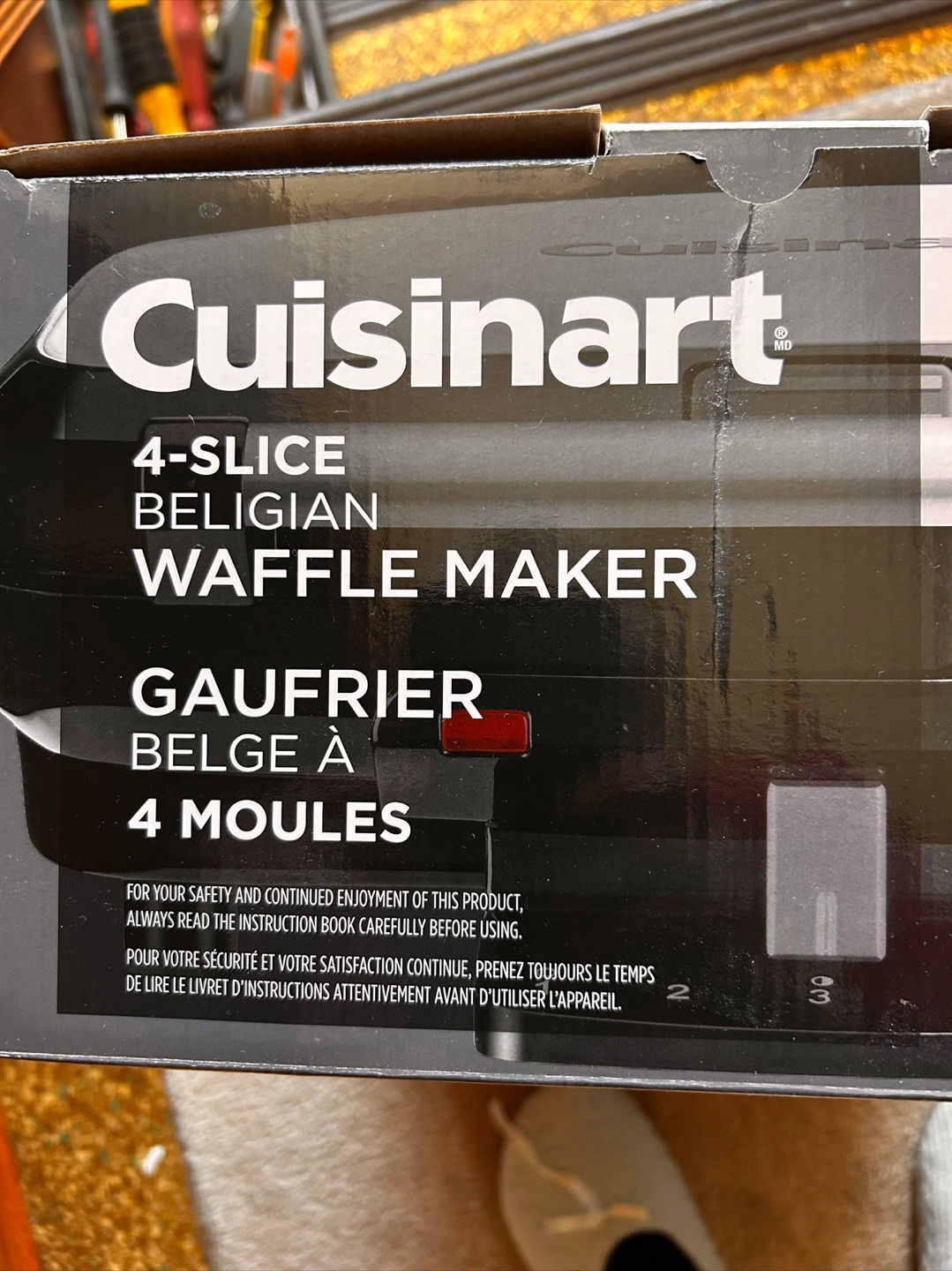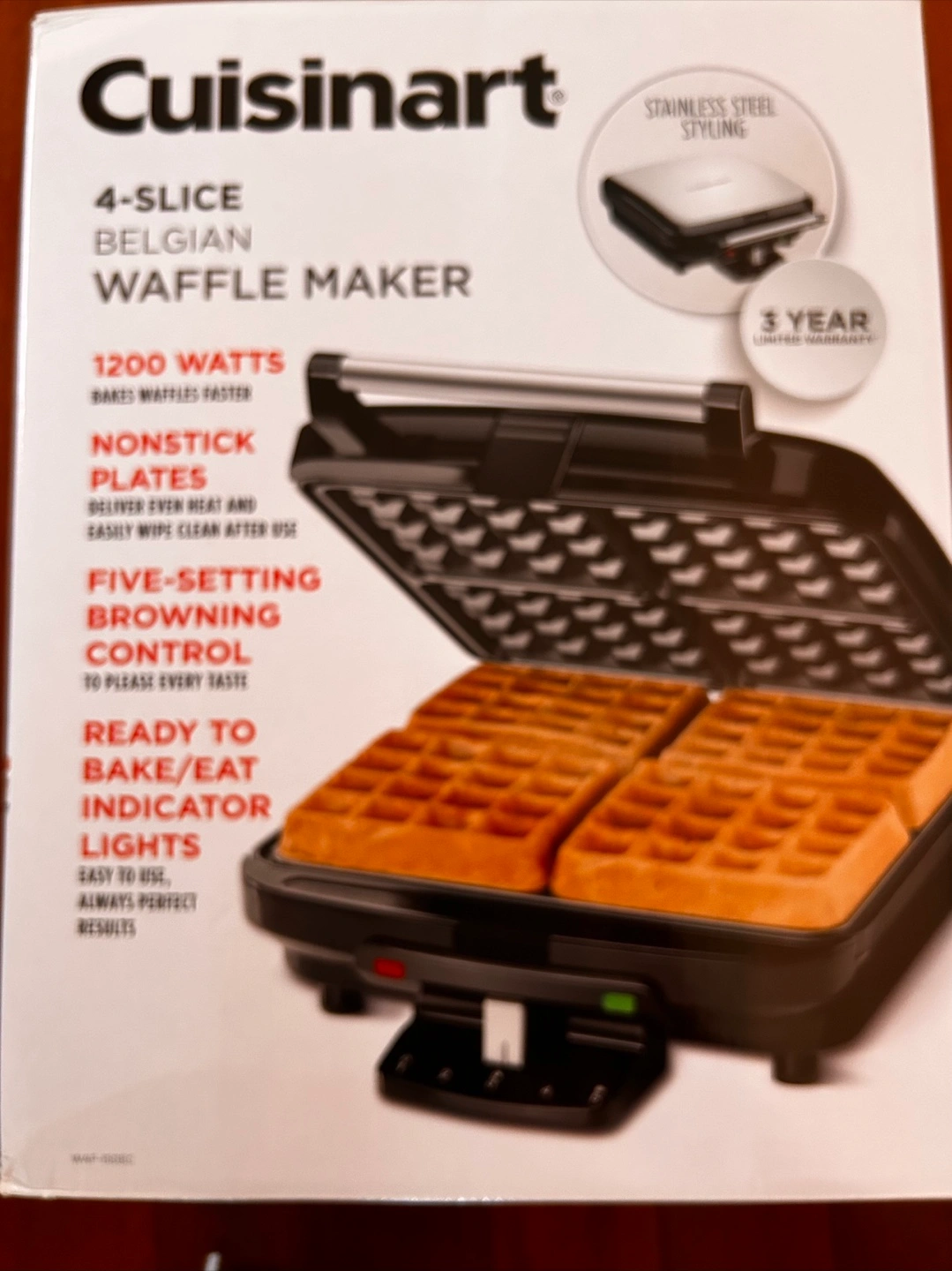 New in box. Four-slice waffle maker. Features non-stick plates, five browning settings, and ready-to-bake indicator lights. 1200 watts. Stainless steel styling. Cool touch handle.