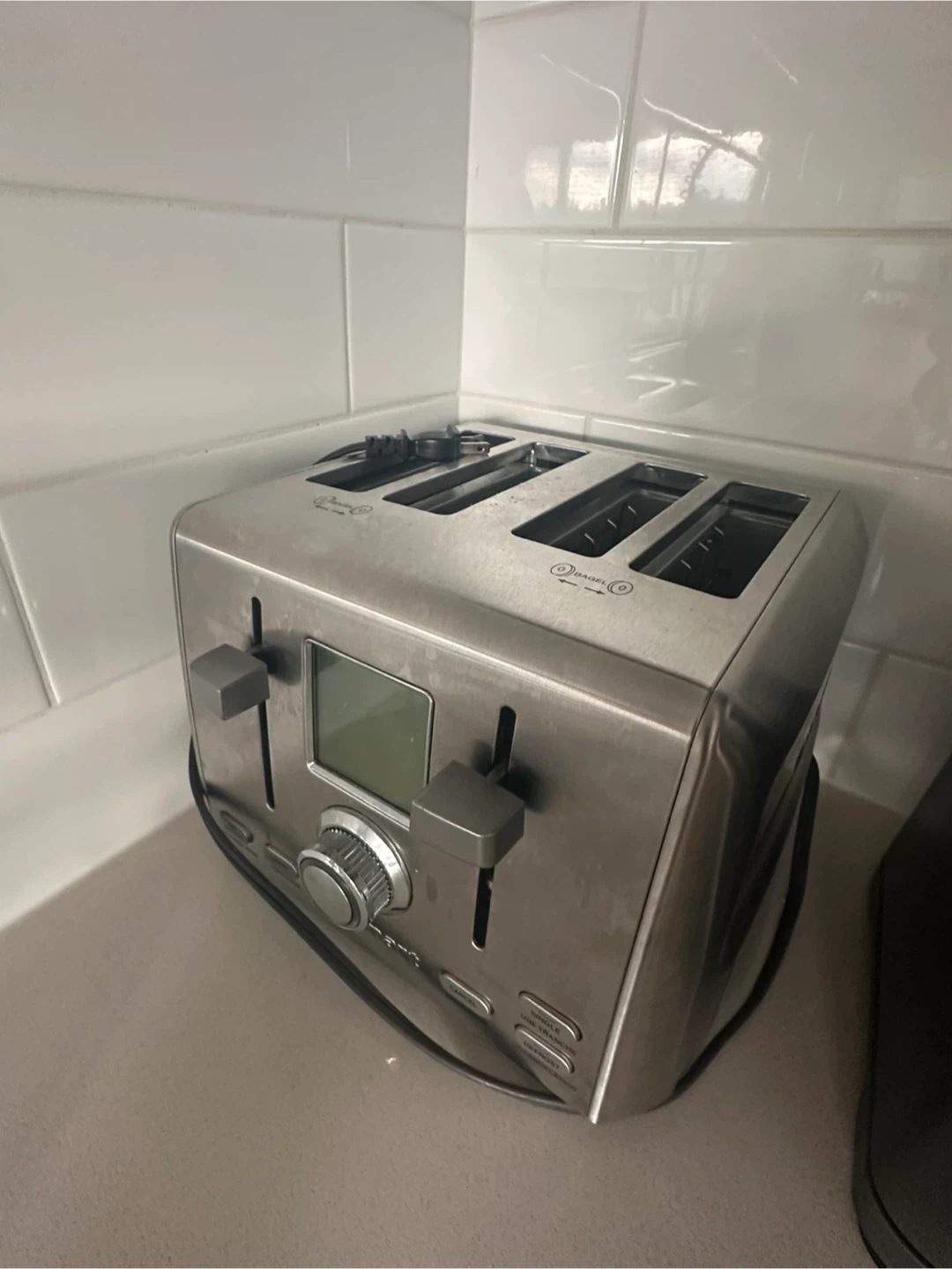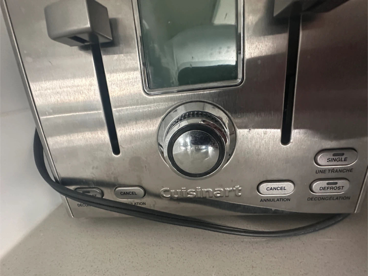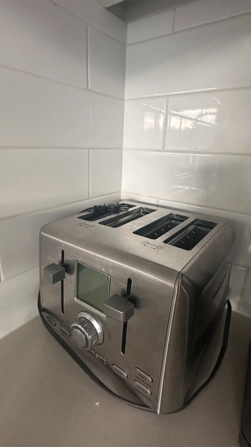 Selling a Cuisinart 4-slice toaster in brushed stainless steel. It's in great working condition and would be a welcome addition to any kitchen. It has settings for single slice, defrost, and decongelation.