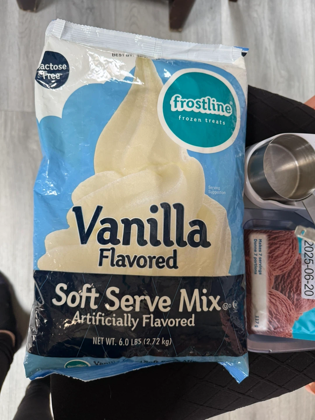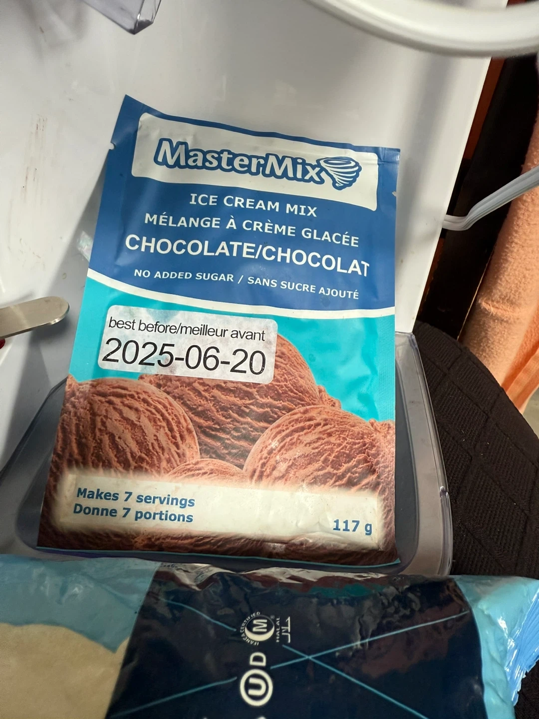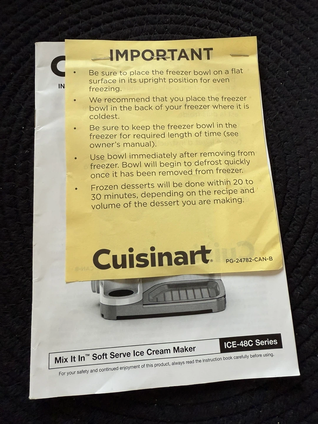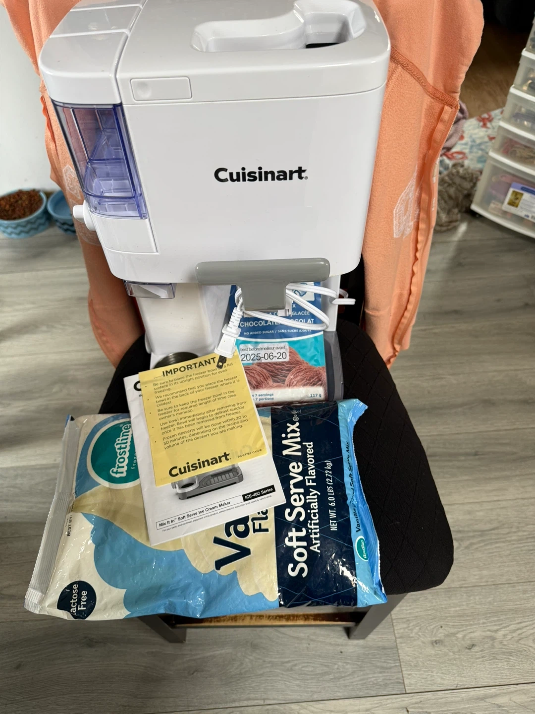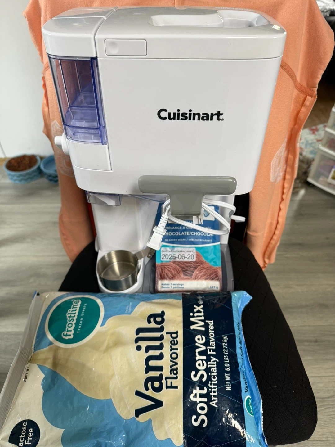 Get ready for summer with this Cuisinart Mix It In™ Soft Serve Ice Cream Maker, model ICE-48C! It comes with a MasterMix Chocolate Ice Cream Mix and Frostline Vanilla Flavored Soft Serve Mix to get you started. The chocolate mix is best before 2025 June 20. Also includes the instruction manual