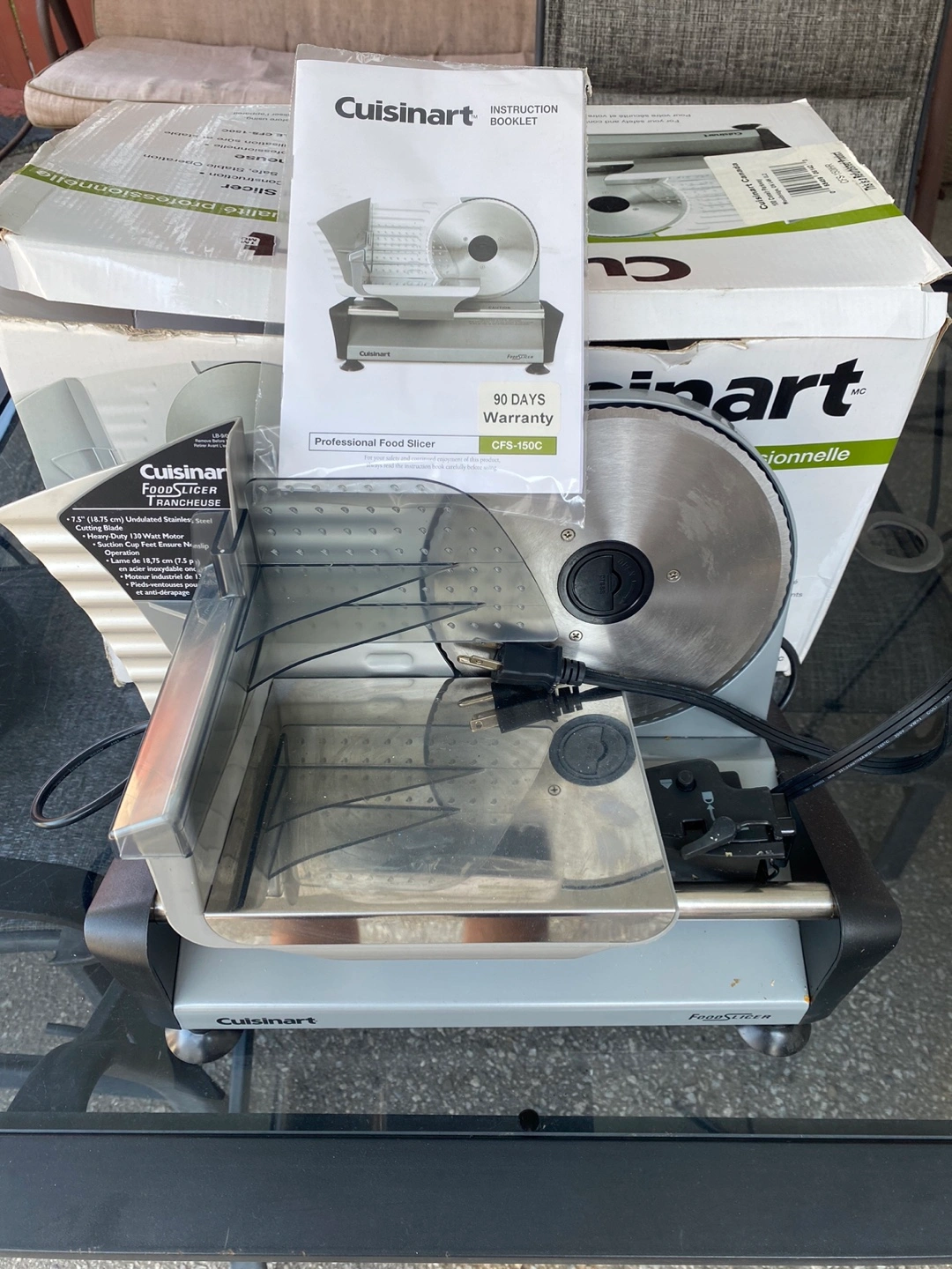 Cuisinart food slicer, model CFS-150C. New in box, never used. Includes instruction booklet. 7-inch blade. Powerful motor. Durable construction. The box does have some damage though.