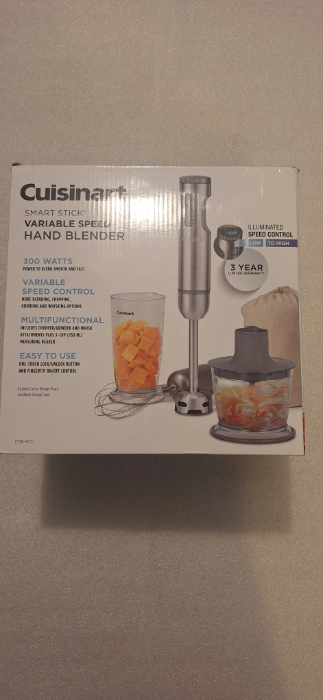 Selling a Cuisinart Smart Stick variable speed hand blender! It's a multifunctional device that includes a chopper/grinder and whisk attachments, plus a 3-cup (750ml) measuring beaker. It has variable speed control for more blending, chopping, grinding, and whisking options. The blender is easy to use with a one-touch lock/unlock button and fingertip on/off control. It also has an illuminated speed control from low to high.