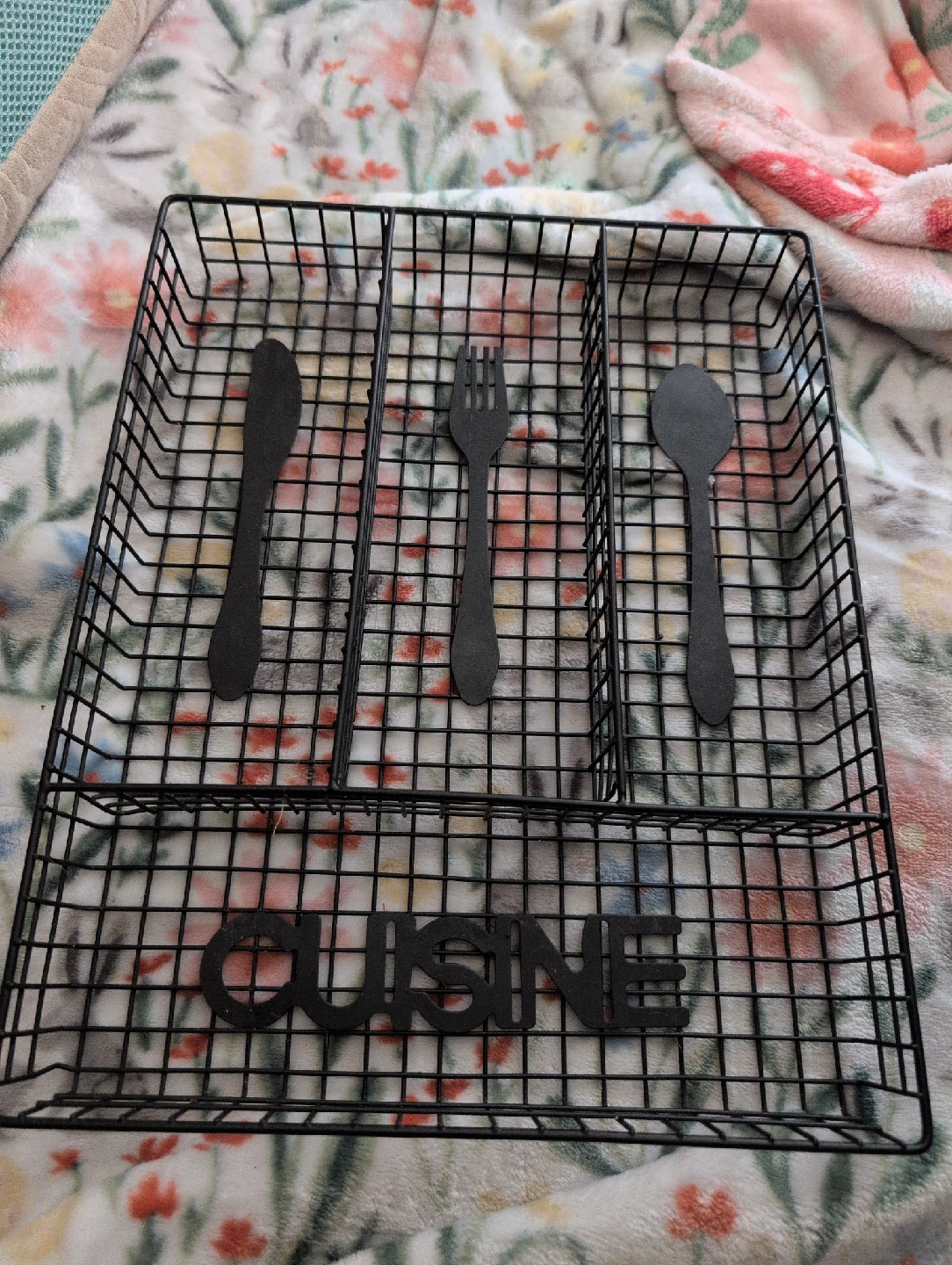 Here's a black wire cutlery tray with 'Cuisine' spelled out at the front. It's perfect for keeping your knives, forks, and spoons organized in your kitchen drawer or on your countertop