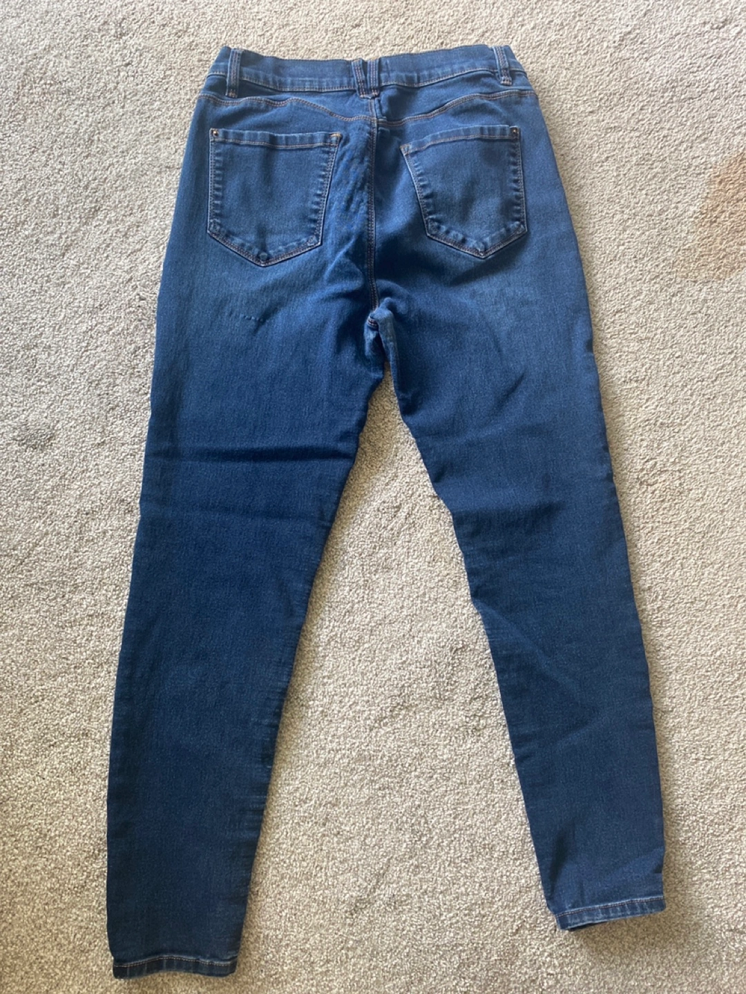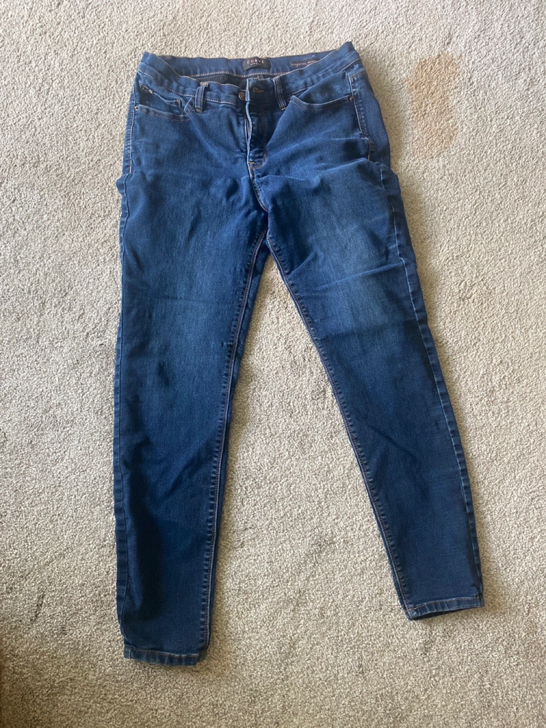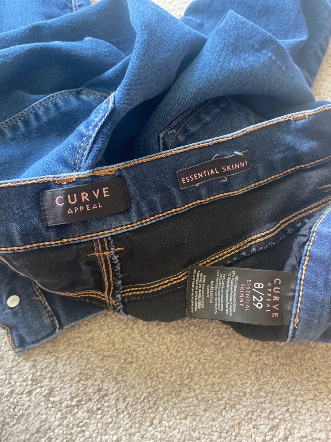 Selling a pair of Curve Appeal Essential Skinny jeans in size 8/29. They're a lovely dark blue colour and made of a comfy blend of 73% cotton, 25% polyester, and 2% spandex.