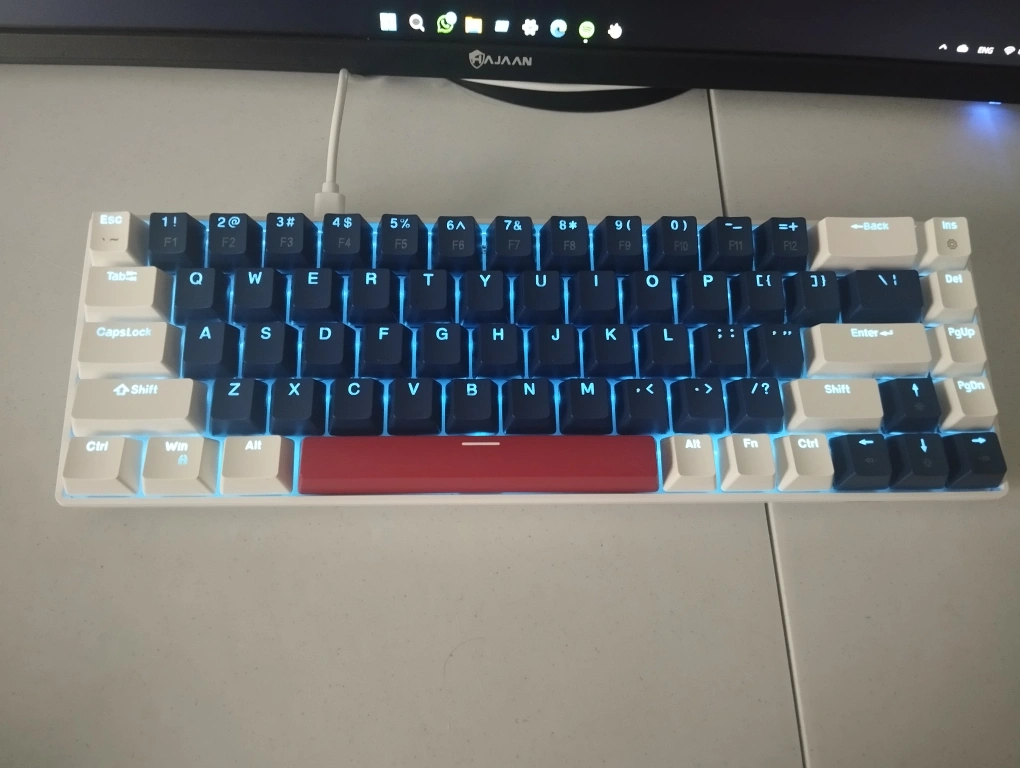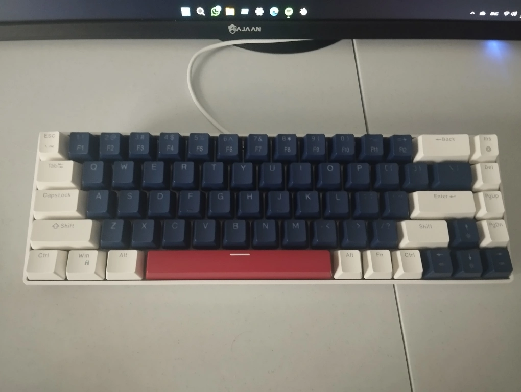 Selling a custom-built 60% mechanical keyboard! It features a unique colour scheme with white, navy blue, and red keycaps. Perfect for gamers or anyone who enjoys a compact and stylish keyboard
