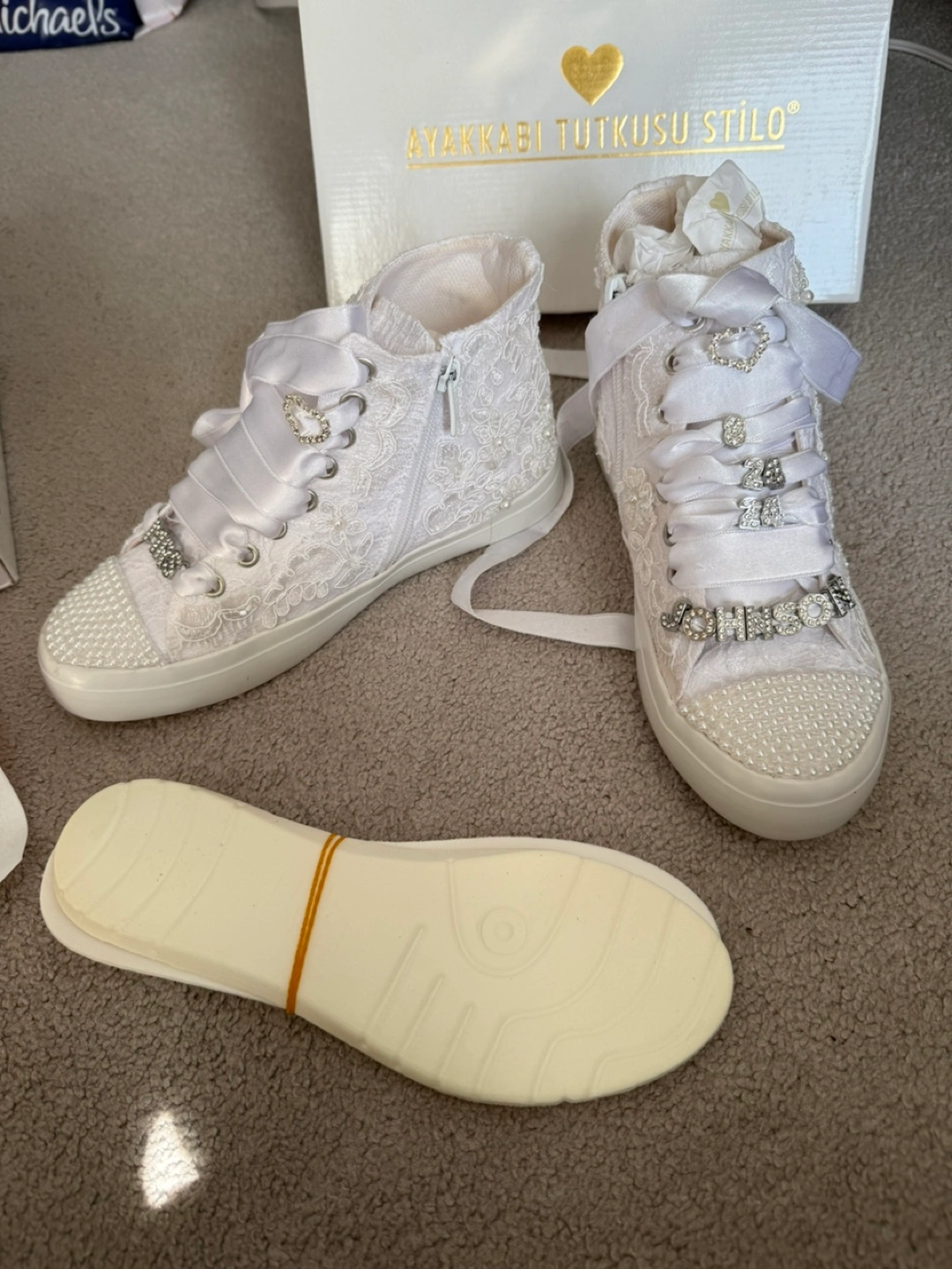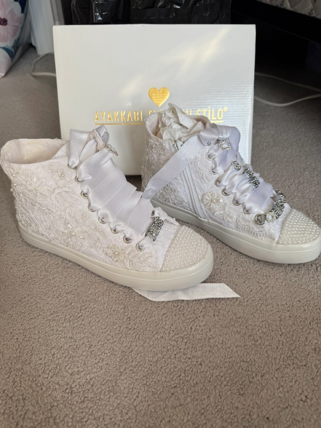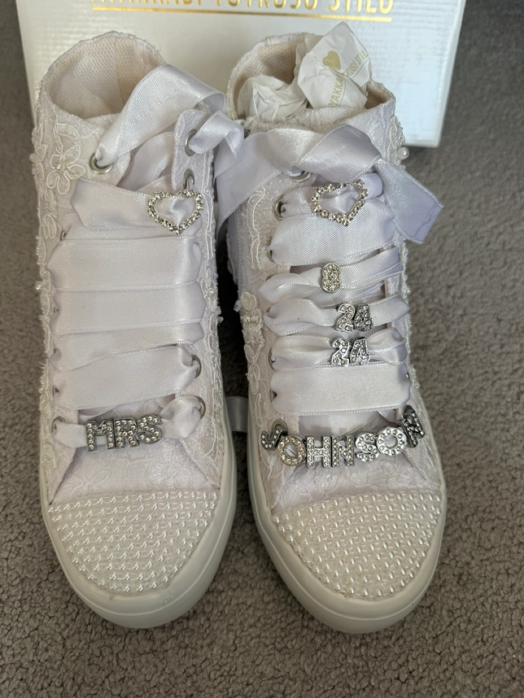Luxury lace/beaded Bridal Wedding Sneakers, size 7 US. You can remove the laces to replace the letters and date for your own last name and wedding day! Originally purchased by StiloShoes on Etsy for 180$ (last pic). Comes with optional foam inserts. I never got to wear them, because my hubby gifted us matching reception shoes that I wore instead! But these are soooo cute, so I hope someone does end up wearing them!