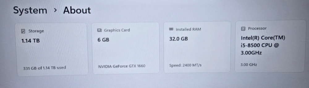 Selling a custom-built gaming PC in great condition! Here are the specs: - Processor: Intel(R) Core(TM) i5-8500 CPU @ 3.00GHz - RAM: 32.0 GB - Storage: 1.14 TB - Graphics Card: NVIDIA GeForce GTX 1660 - window 11 It's ready to play your favourite games!