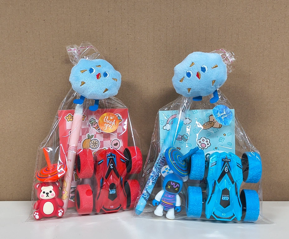 Budget friendly loot bags for kids ! -1* fun toy car -1*wooden spinning top -1*mini notebook -1*Erasable pen -1*Bear keychain -1*cute cookie brooch pin