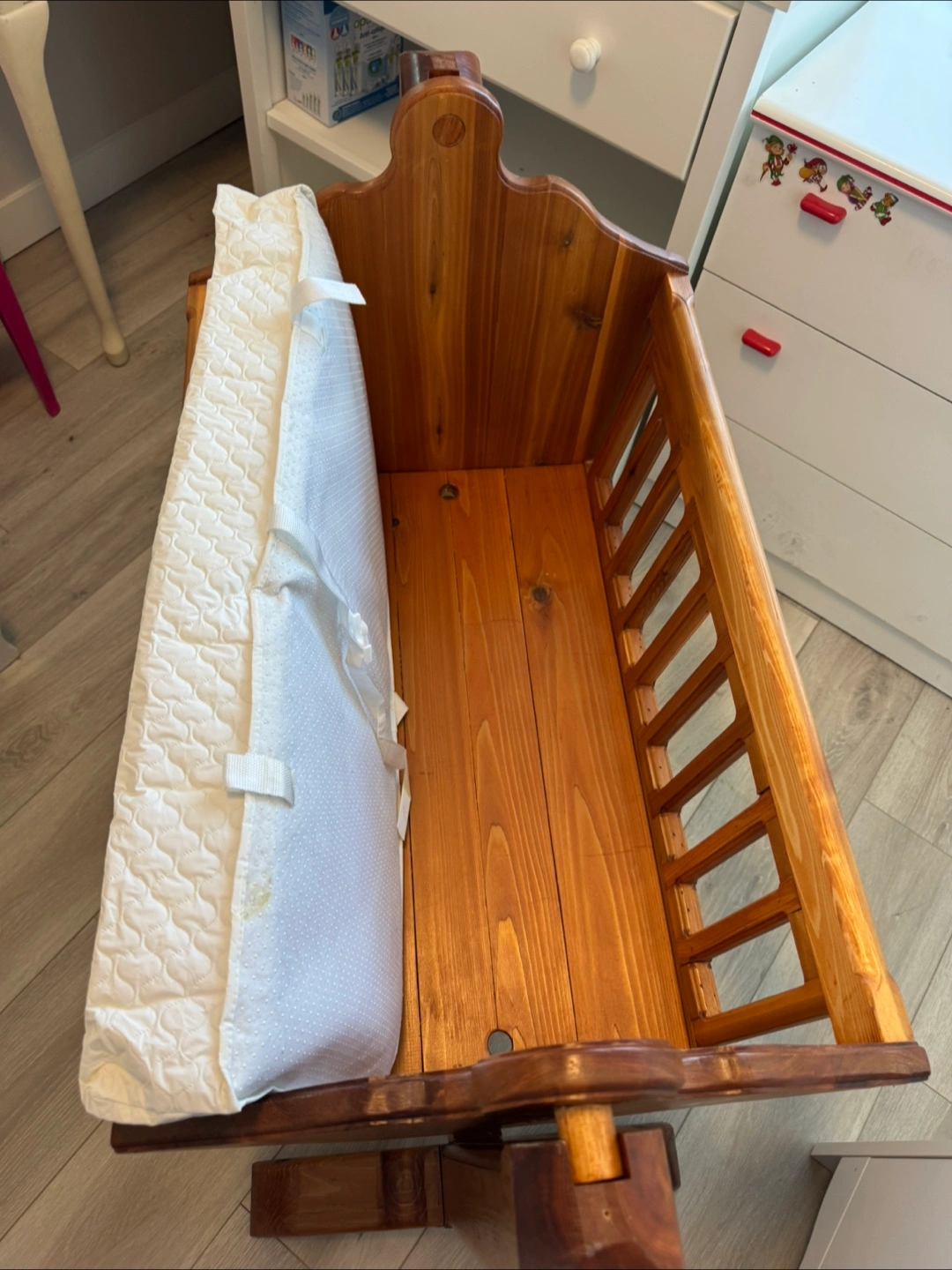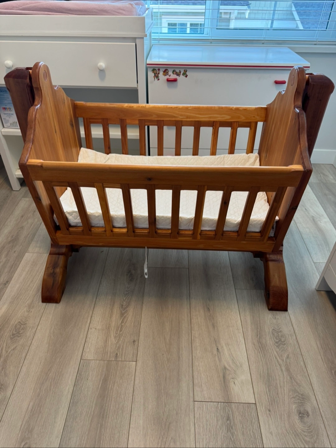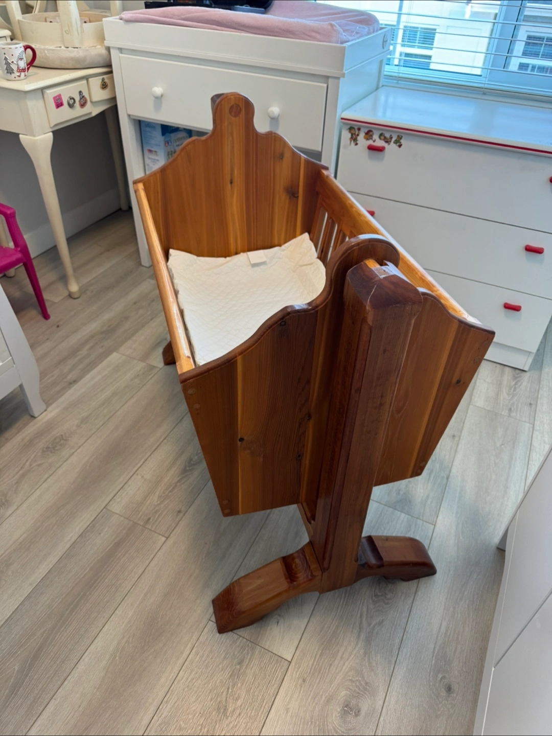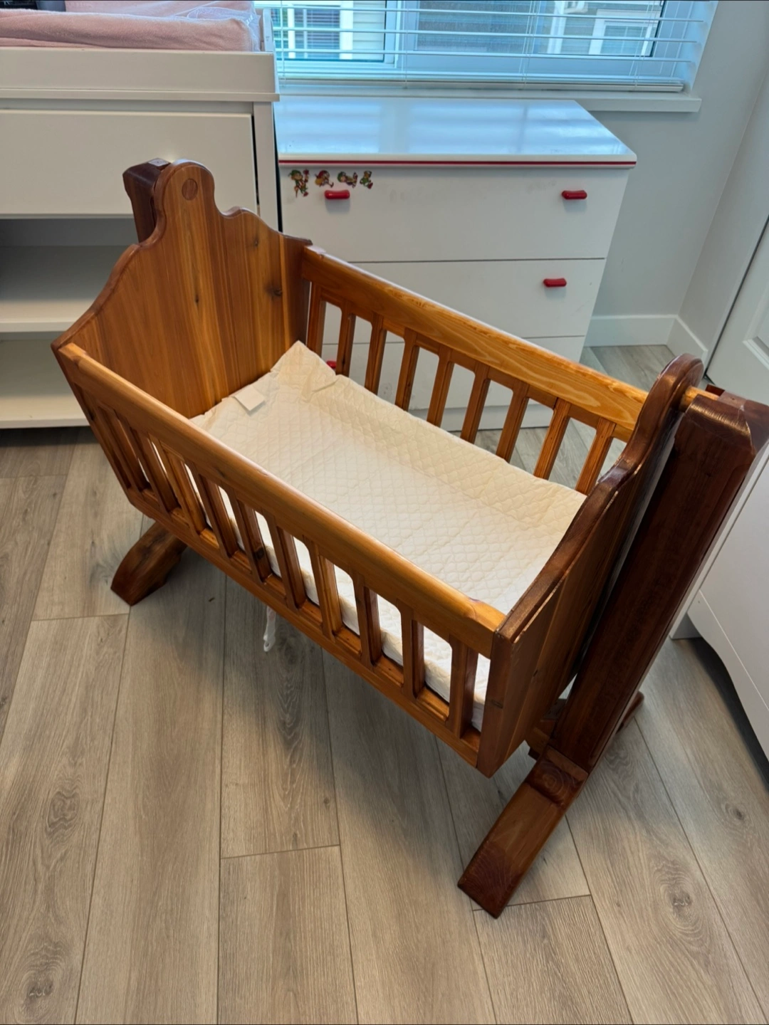 Custom made solid wood baby cradle in great condition. Perfect for a nursery / newborn Comes with a mattress pad. has a swivel that allows to rock back and forth