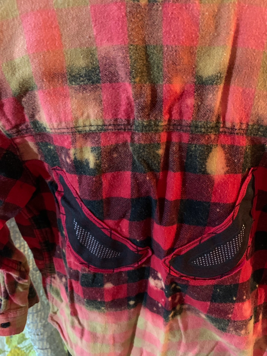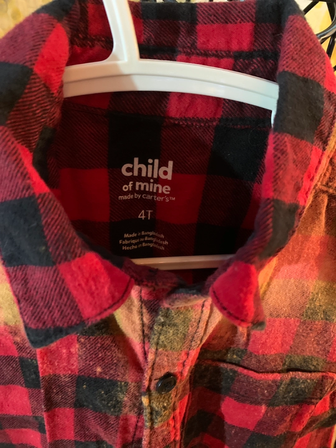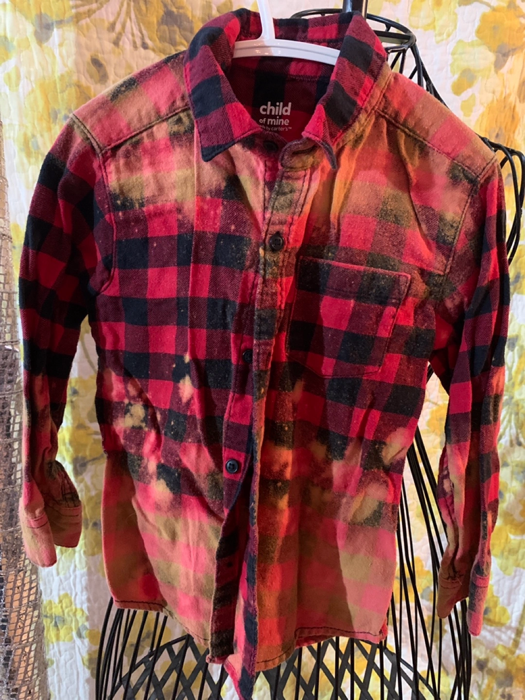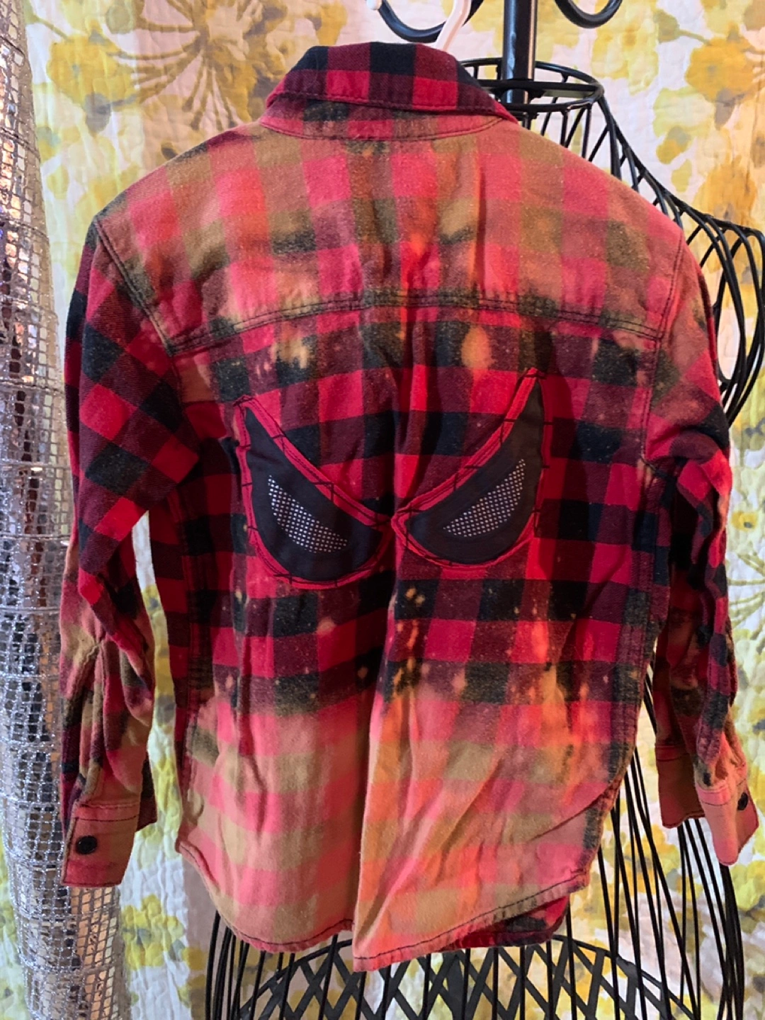 Unique red and black plaid flannel shirt. Features custom hand bleach design and Spider-Man inspired back detail. Long sleeves and button closure. Child of Mine brand by Carter's. OOAK-Maun by Gerri