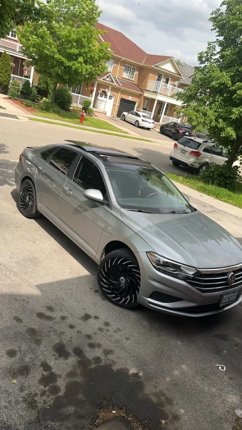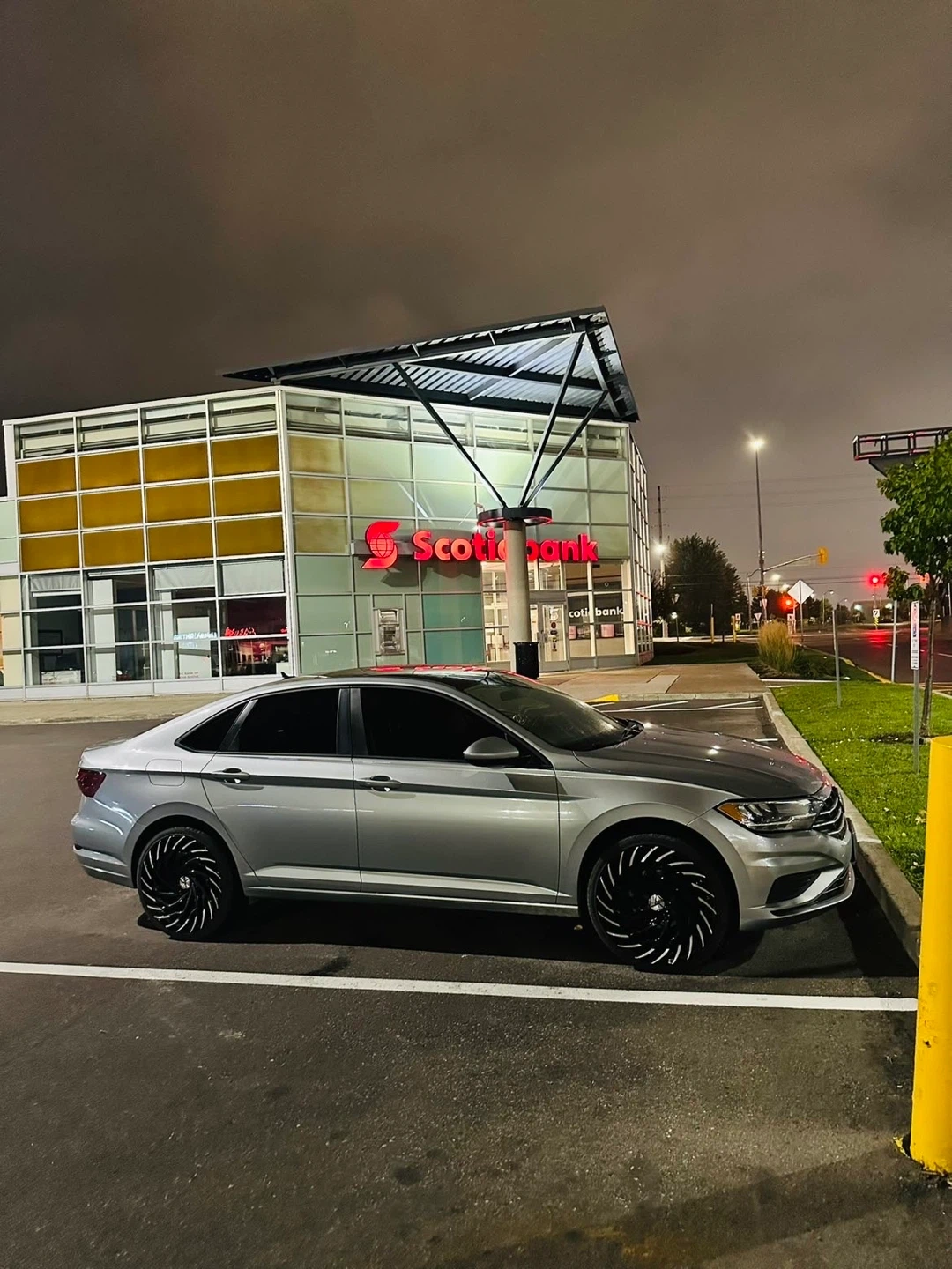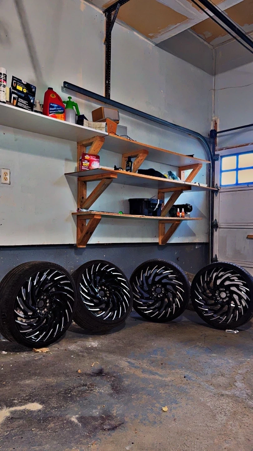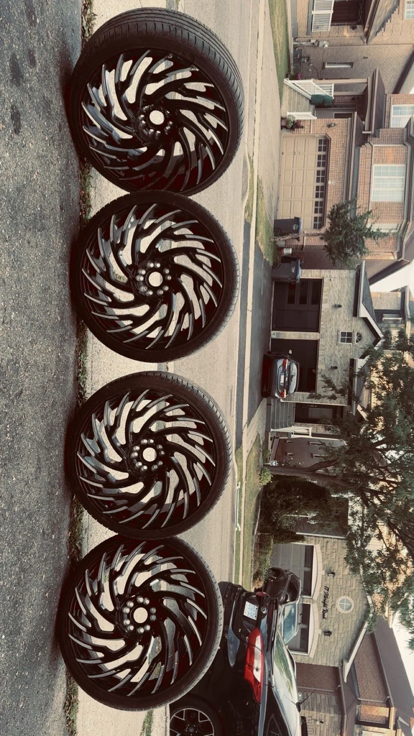 Selling a set of custom wheels and tires. They are black with a unique white swirl design. These wheels will make your car stand out!