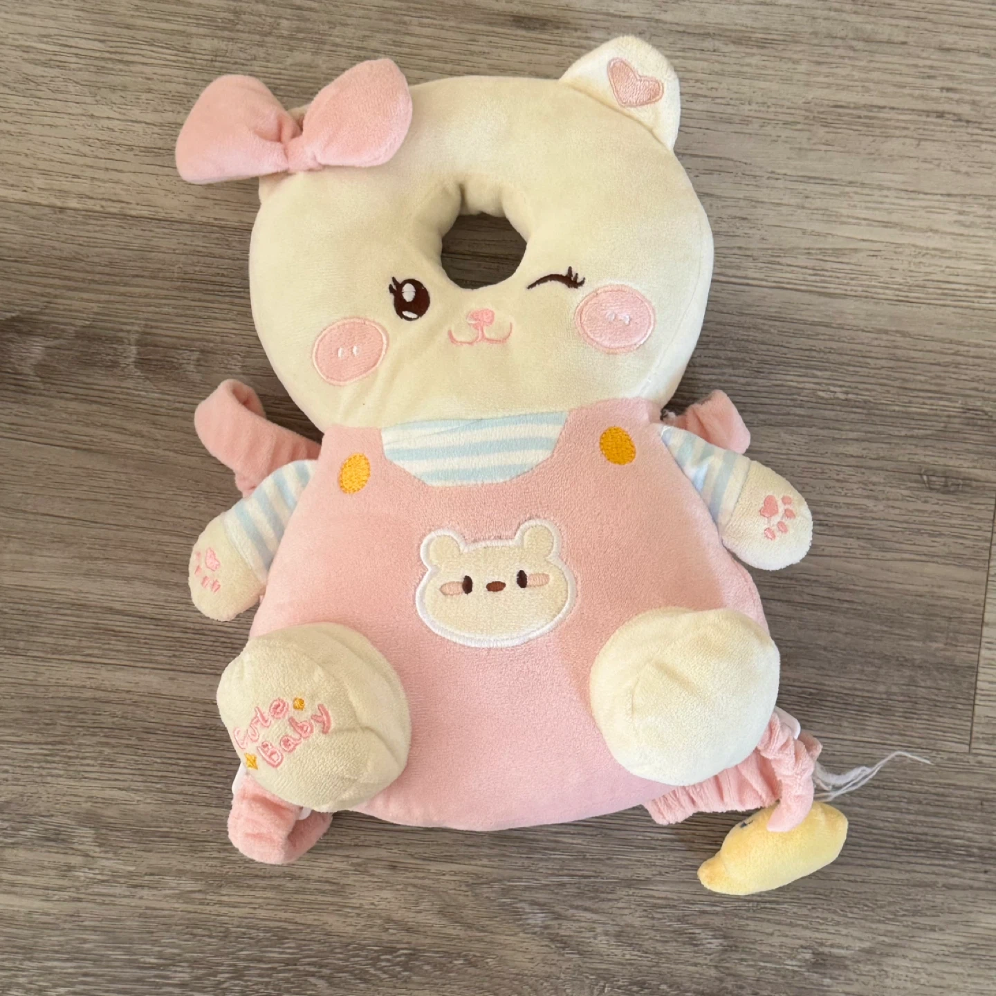 Selling a super cute baby head protector pillow! It's in great condition and ready to keep your little one safe and comfy. It's got a sweet design with a little bear on the front and a donut-shaped headrest with a bow. Perfect for when they're learning to sit or crawl!