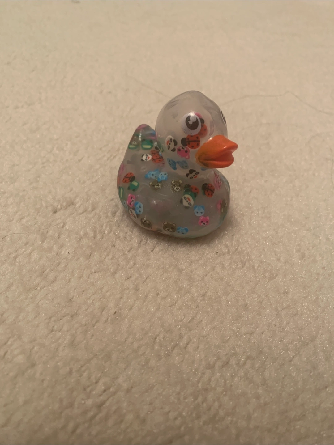 Here's a cute little duck figurine! It's got a clear body with colourful decorations inside. Perfect for adding a bit of charm to any space