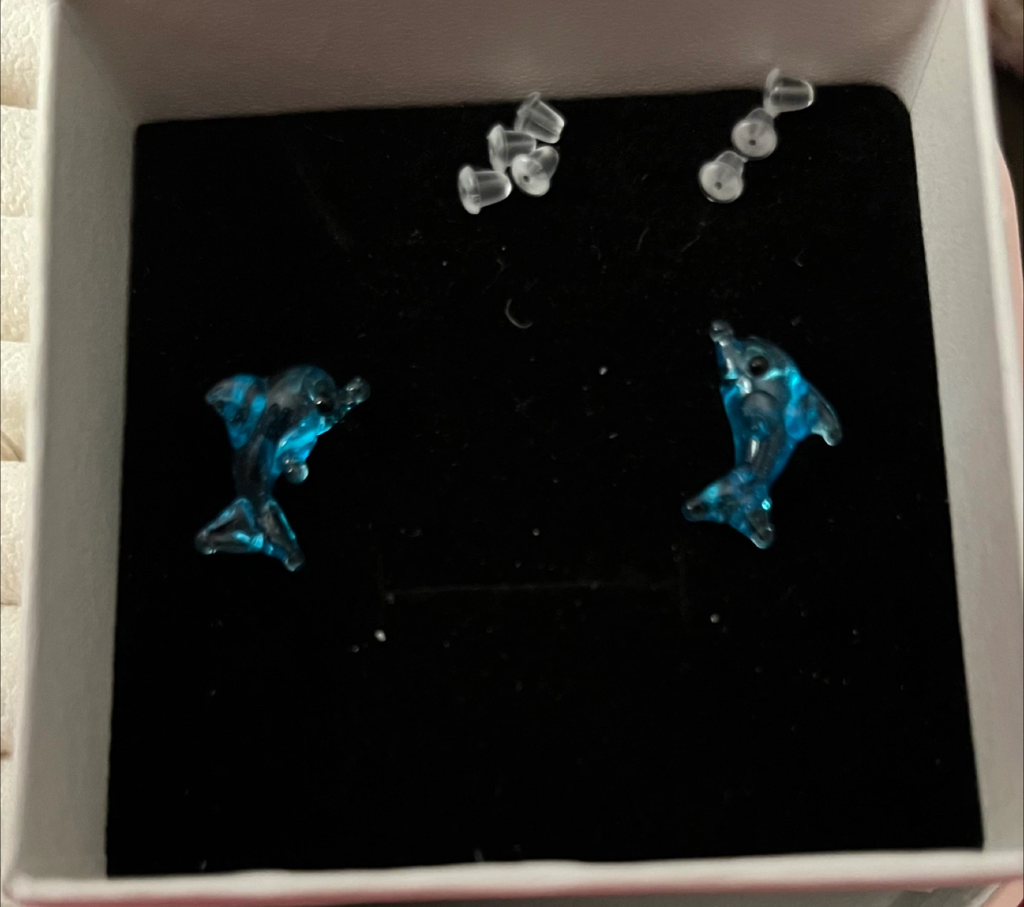 Pair of adorable dolphin stud earrings. Clear blue resin dolphins. Made from blow glass. Got it in Mexico
