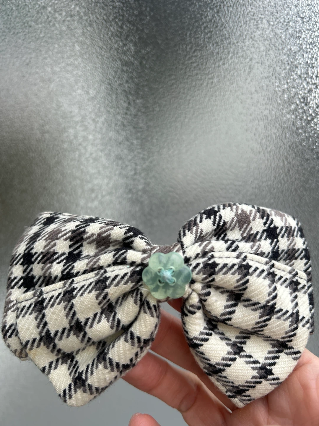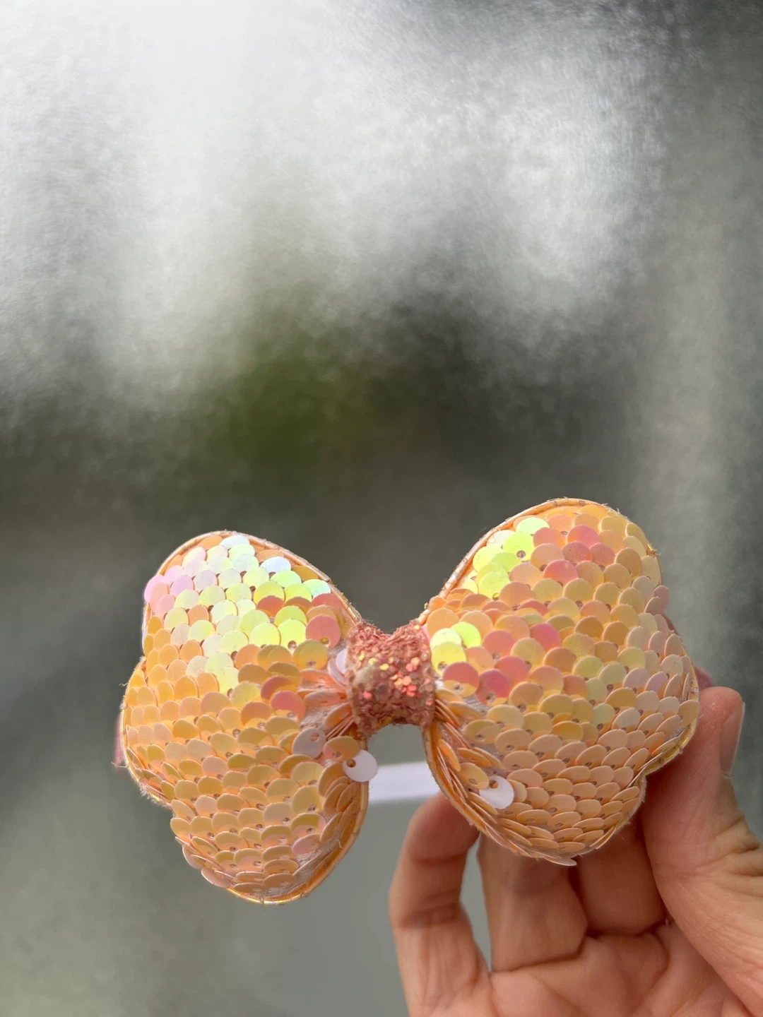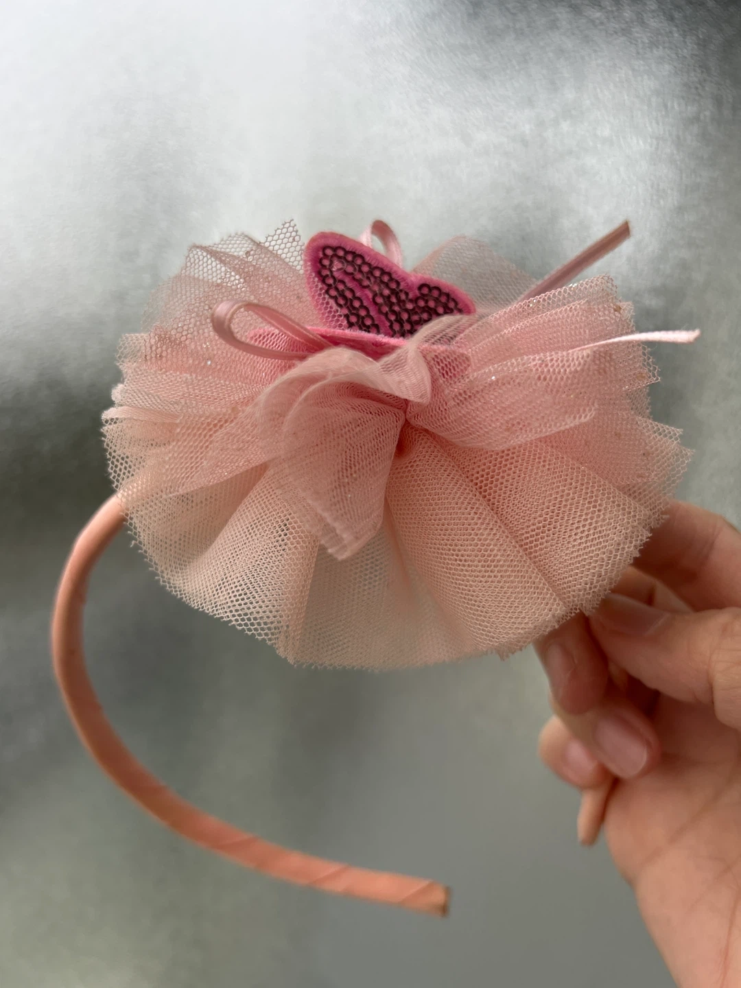Selling a set of three cute headbands and hairpin. They include a sequined orange bow headband, a black and white checkered bow hairpin and a pink tulle flower headband. Perfect for kids!