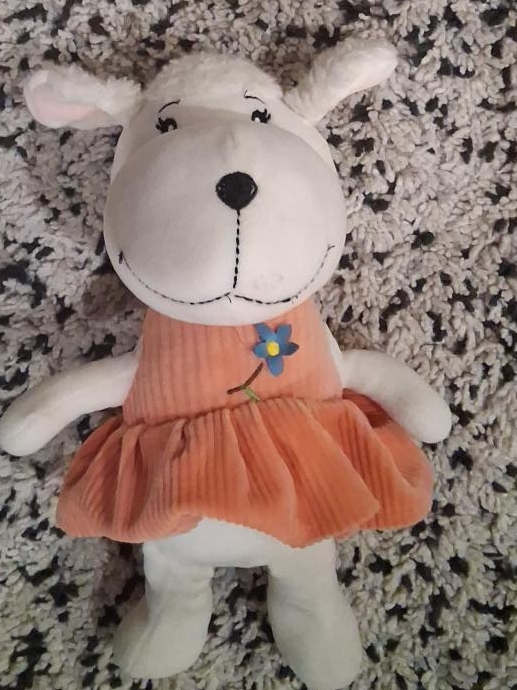 Selling a super cute lamb plush toy! It's white with a sweet little face, and it's wearing an adorable peach-coloured dress with a blue flower. Perfect for cuddling or as a sweet addition to a nursery
