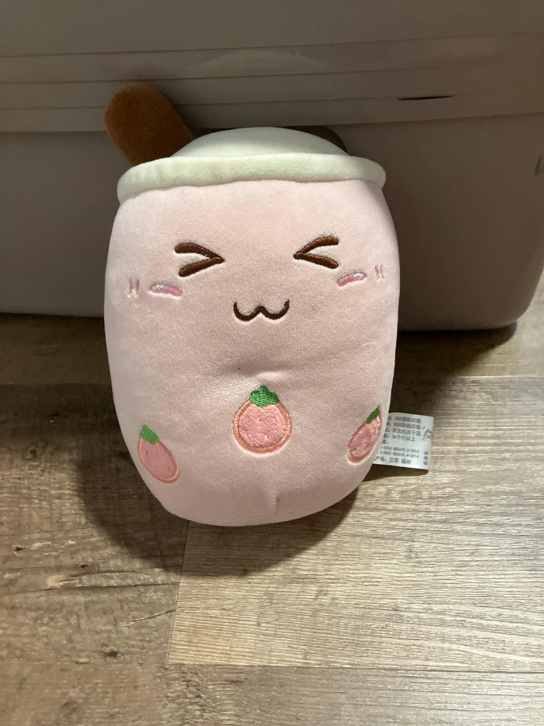 Selling a super cute pink bubble tea plushie! It's in great condition and ready for a new home. It has a sweet little face and embroidered strawberry tapioca pearls.