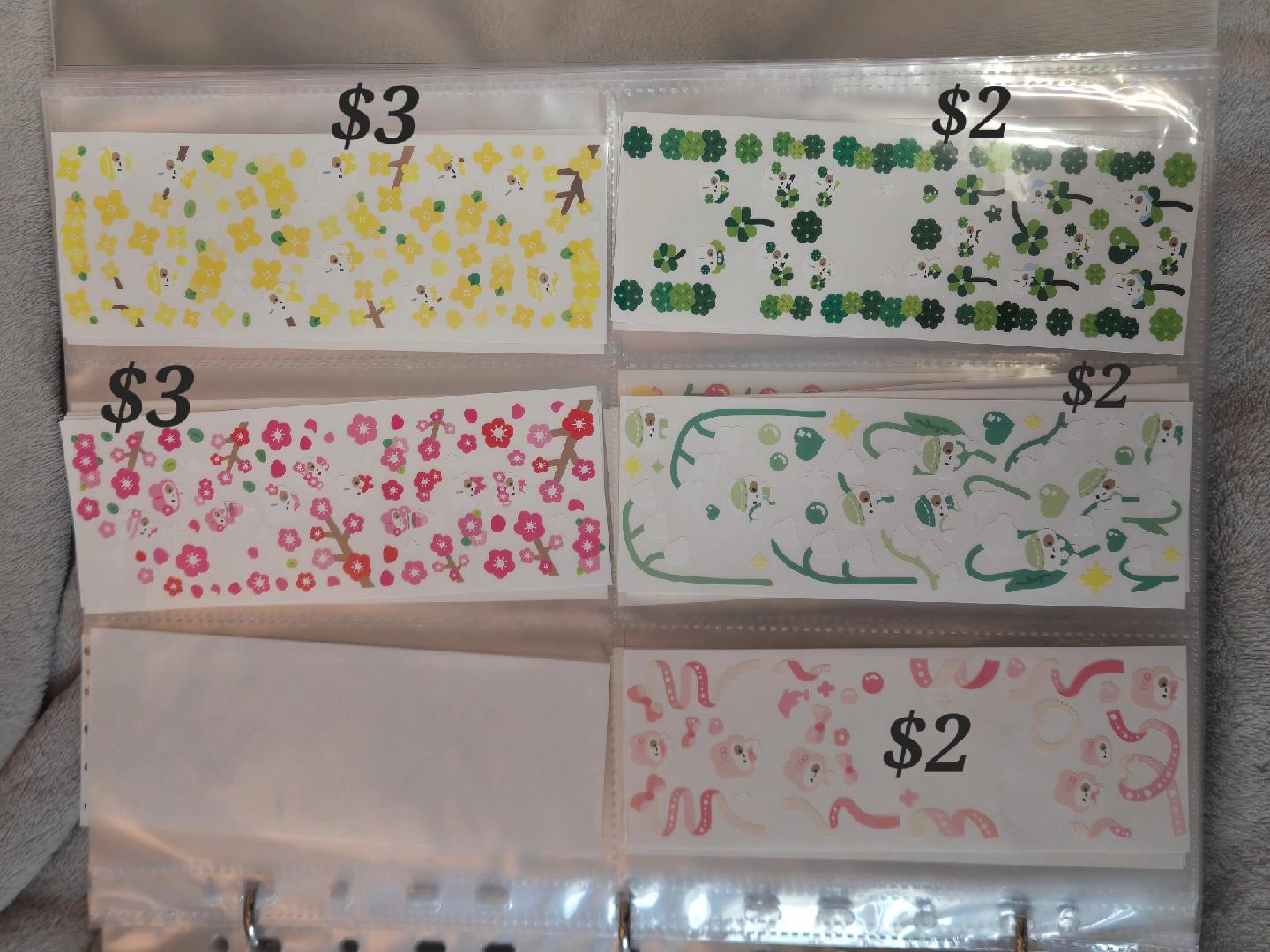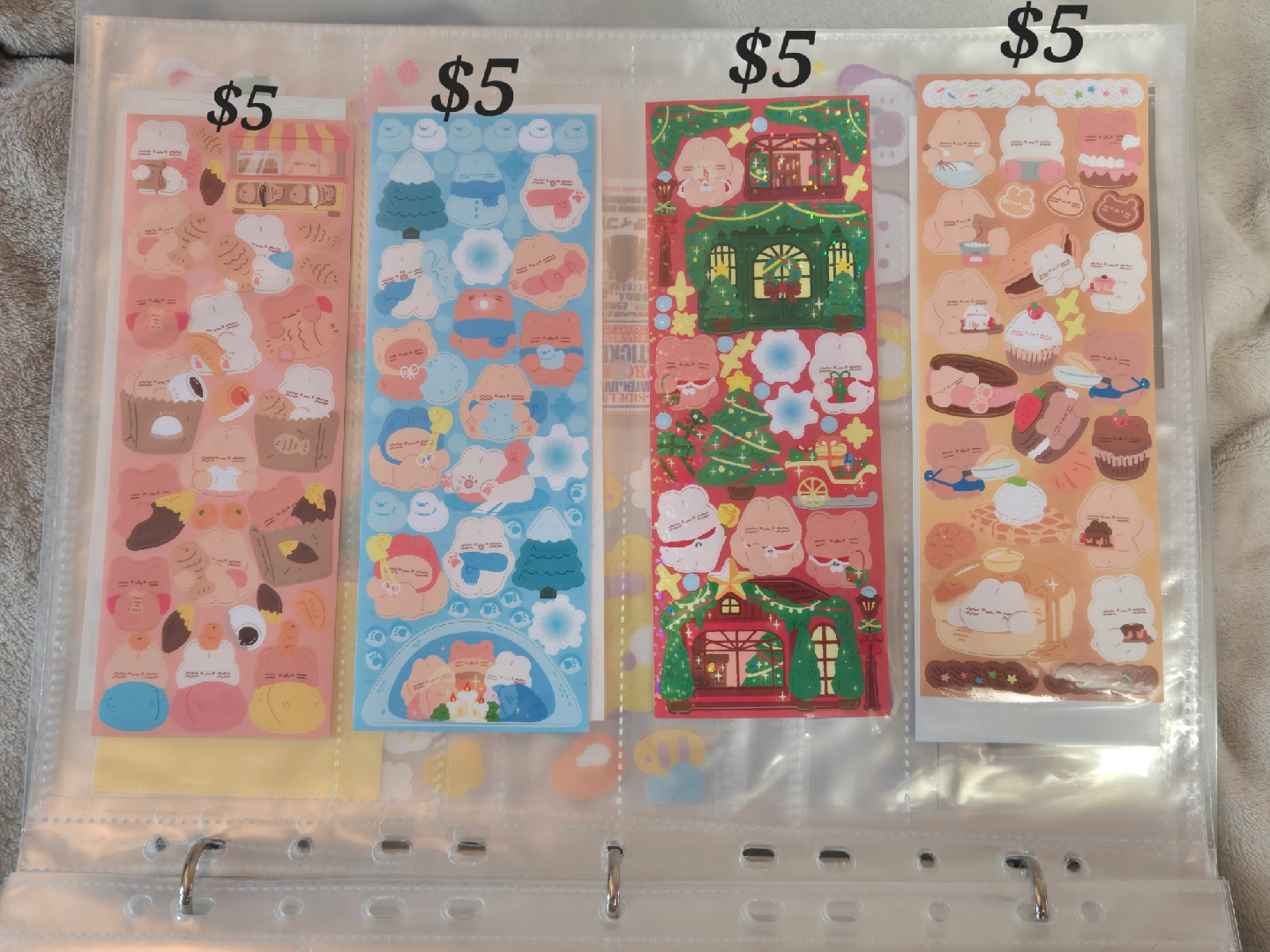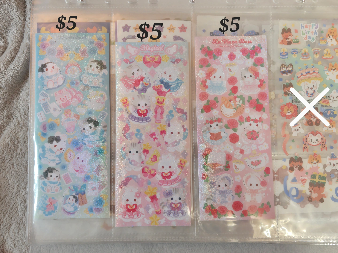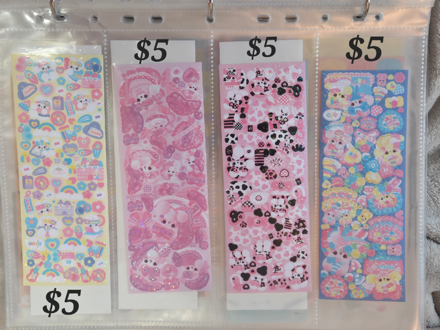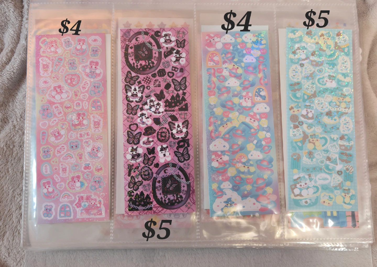 Selling various sticker sheets! Prices range from $1 to $5. Lots of cute designs to choose from. Perfect for scrapbooking, decorating, or just collecting.
