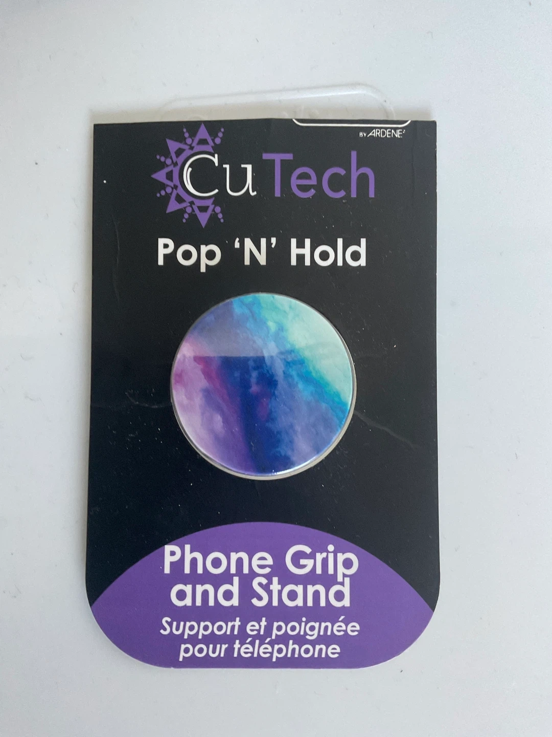 This is a CuTech Pop 'N' Hold phone grip and stand by Ardene. It provides support for your phone. It's brand new in the package. The packaging is a bit damaged