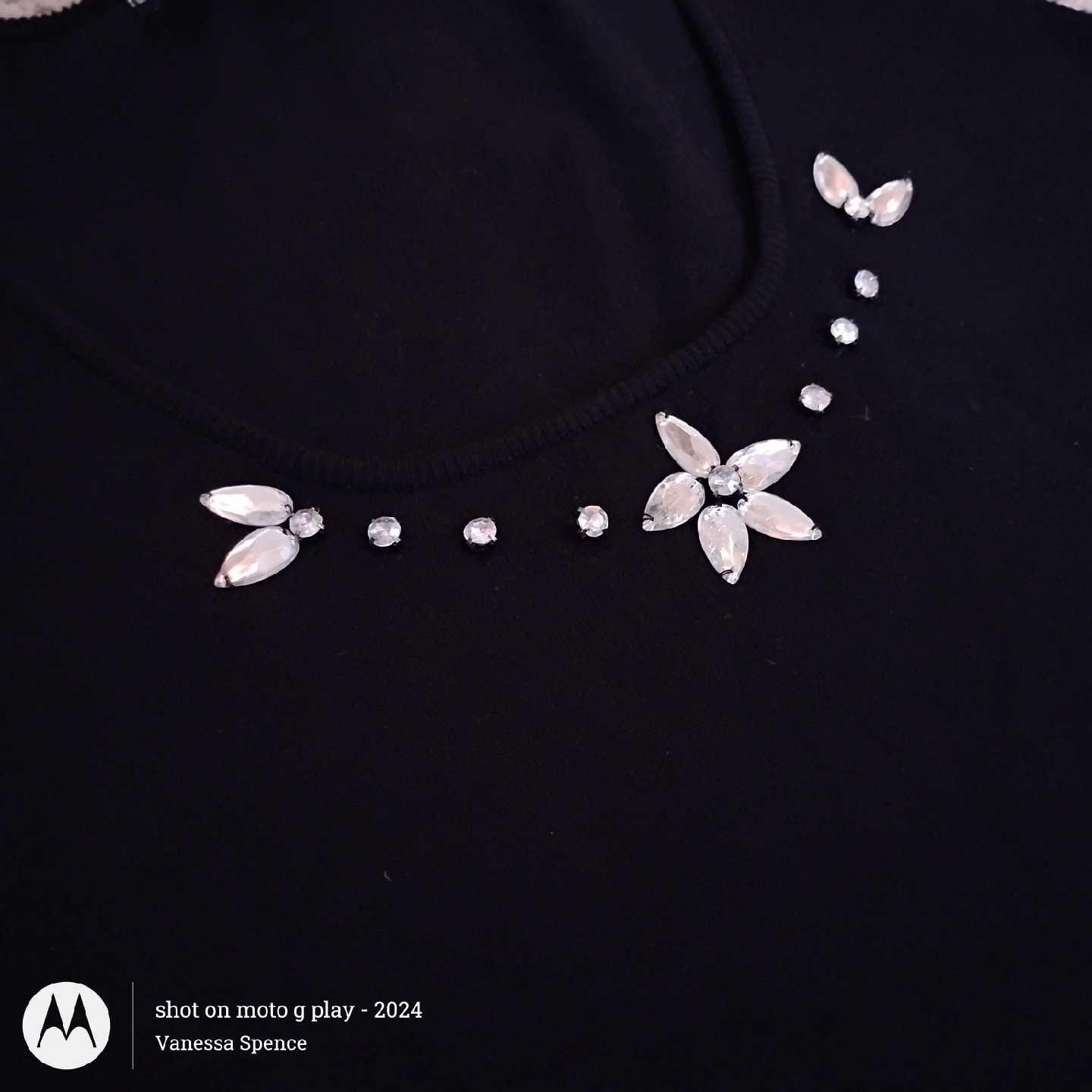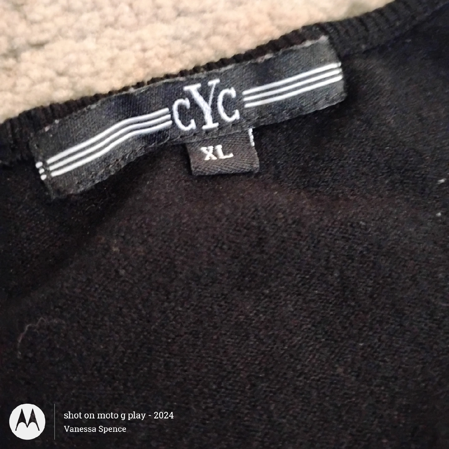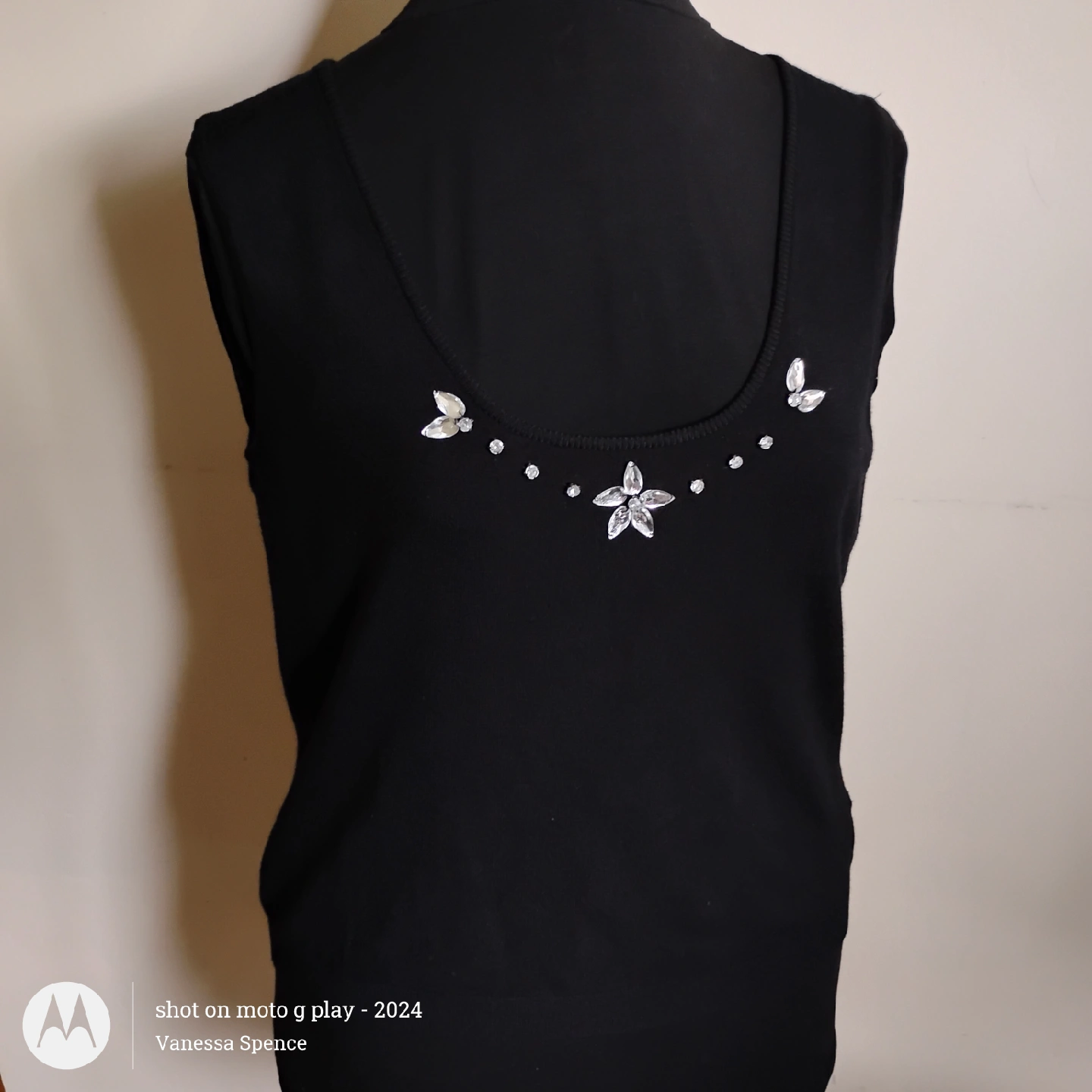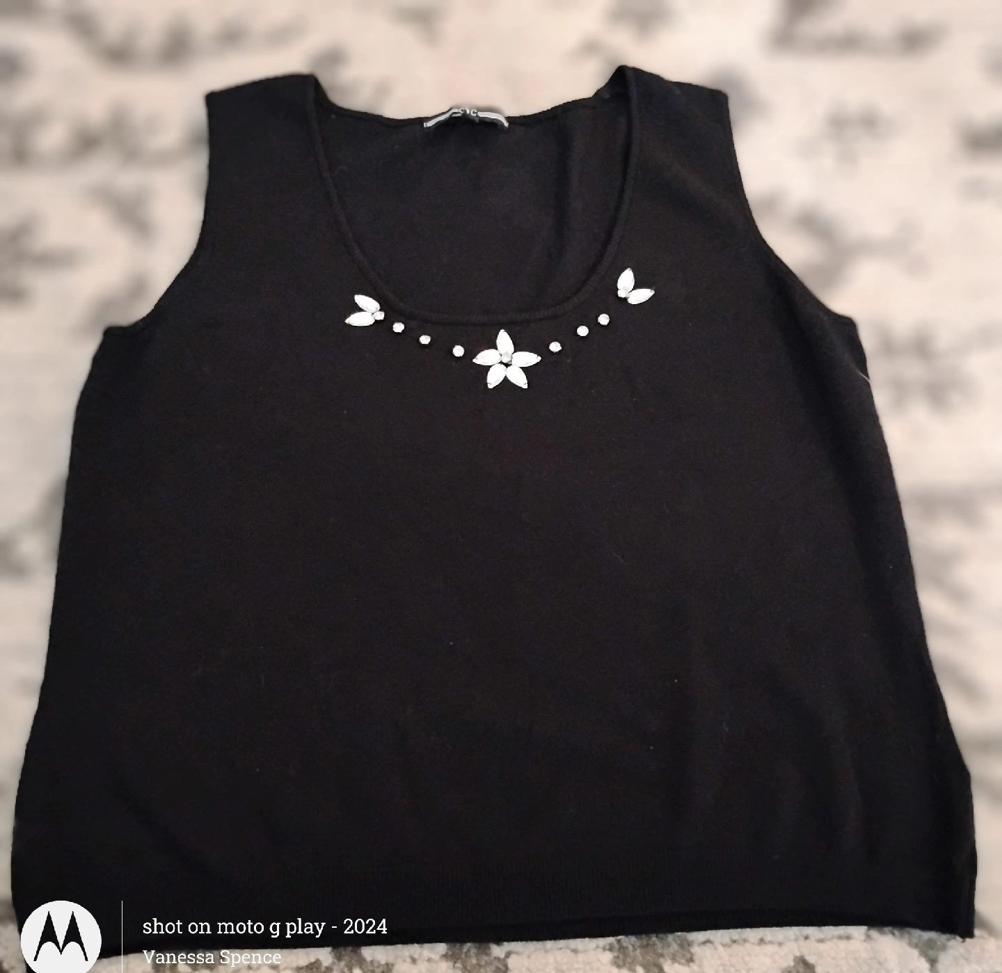 Selling a gently used black sleeveless top from cYC. It's a size XL and features lovely floral and rhinestone detailing around the neckline. Perfect for layering or wearing on its own! Super soft sweater material