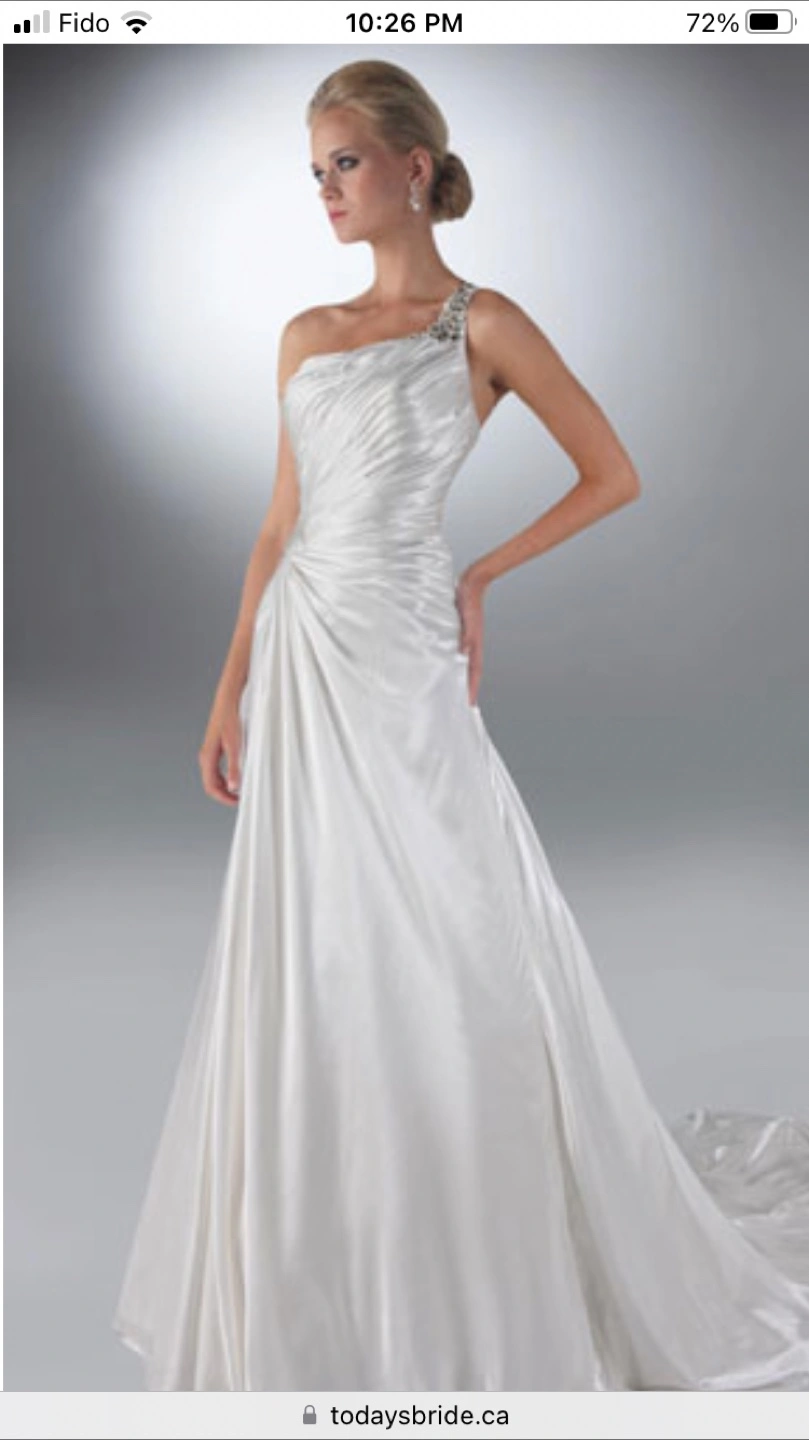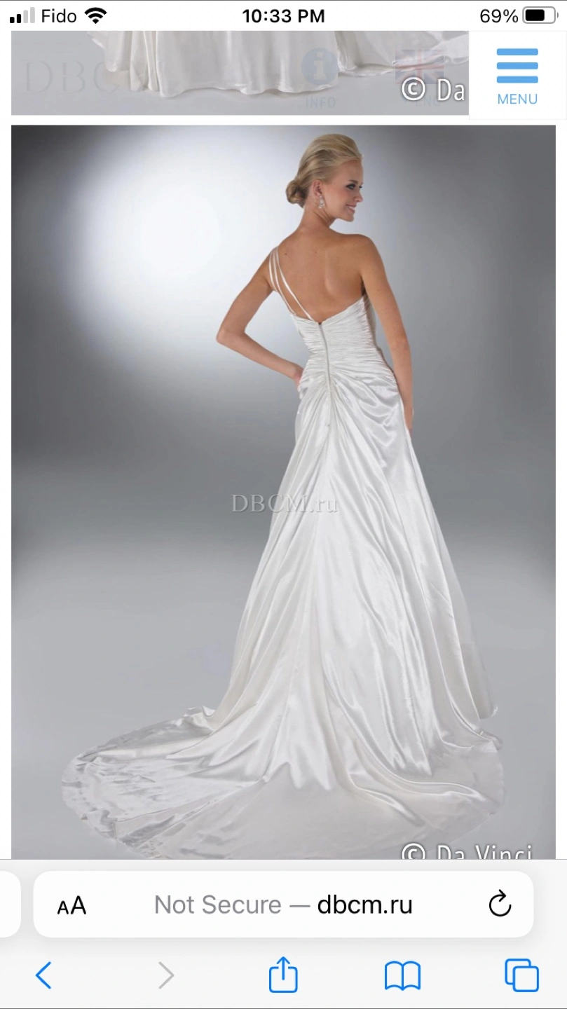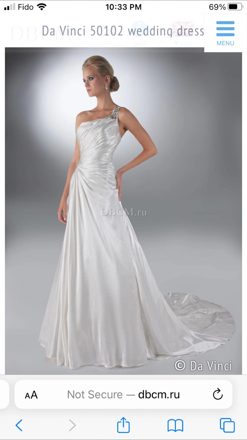 Selling a Da Vinci 50102 wedding dress. It's a beautiful, elegant gown perfect for your special day! The dress features a one-shoulder design and a flowing skirt. If you're looking for a classic and timeless style, this could be the one