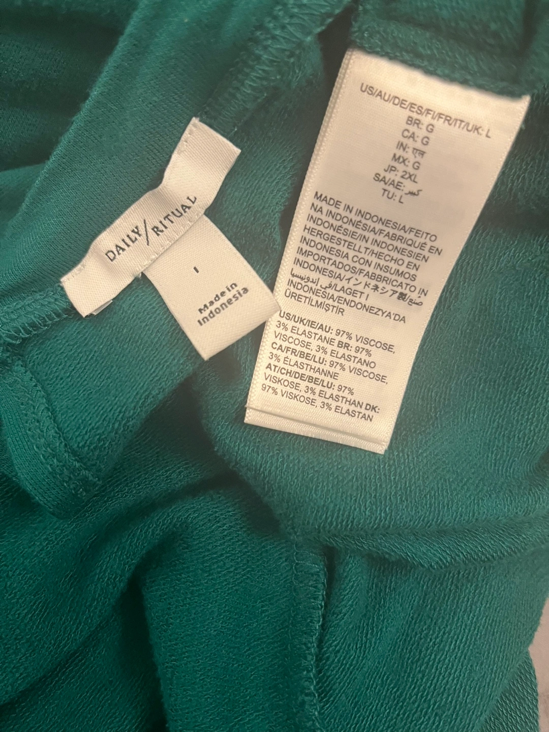 Daily Ritual green jumpsuit in size L! It's made of 97% viscose and 3% elastane, making it super comfy. Perfect for lounging or a casual day out