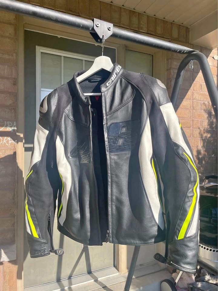 Selling my Dainese VR46 leather motorcycle jacket, size Medium. It’s a premium-quality jacket inspired by Valentino Rossi (VR46), made with genuine leather and high-end protection. It’s slightly used, always well cared for, and in excellent condition — no rips, tears, or major wear. ✅ Genuine Dainese leather jacket ✅ Includes built-in shoulder and elbow armor ✅ VR46 design with sporty black, white & neon accents ✅ Great comfort and top-level protection ✅ Pickup in Ajax Asking $250 (firm) — a great deal for a Dainese VR46 jacket in this condition.