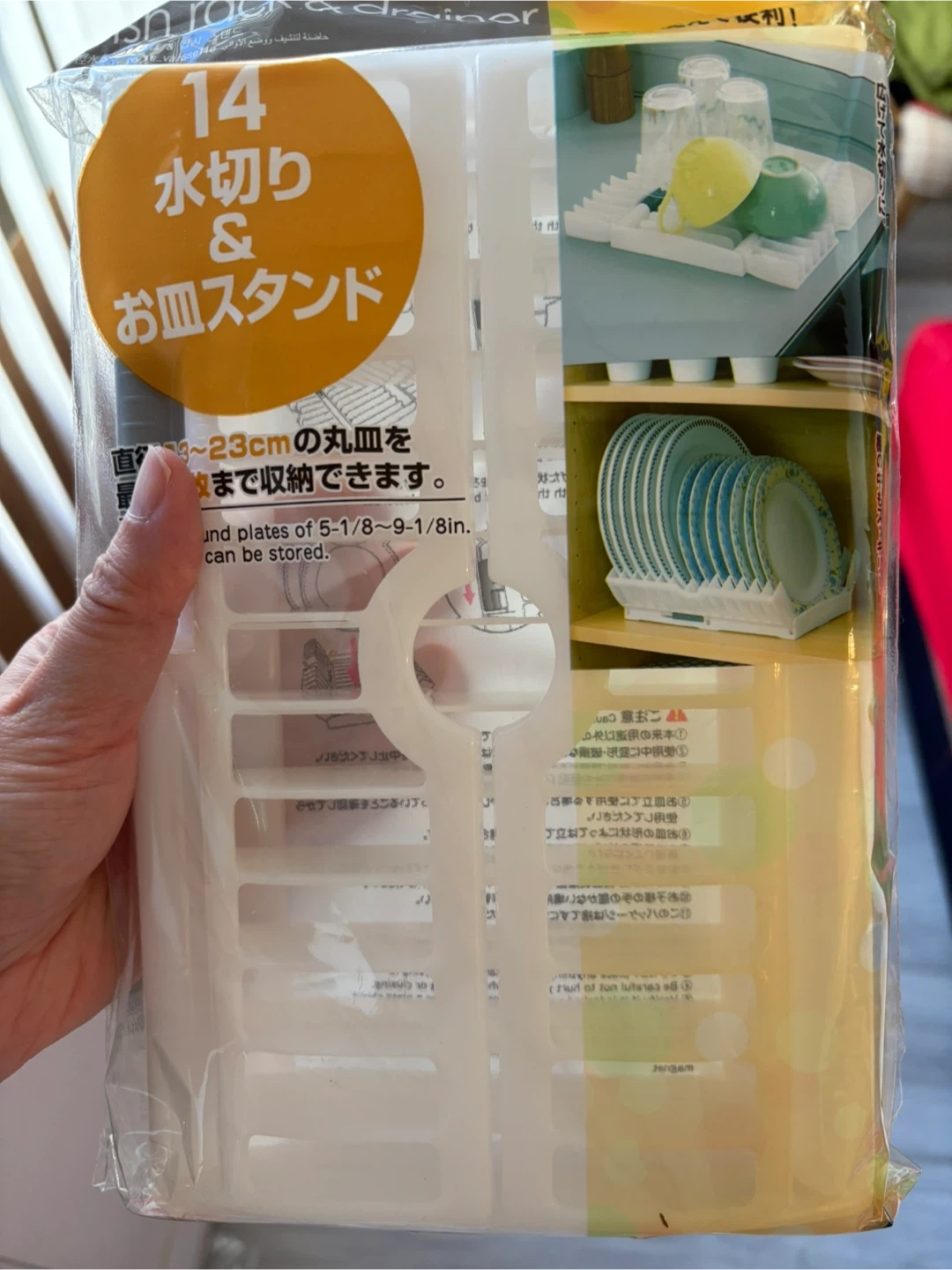 I have a brand new Daiso dish rack and plate stand still in its original packaging. It's perfect for organizing your dishes and saving space in your kitchen. It can hold round plates of 5-1/8 ~ 9-1/8 inches.