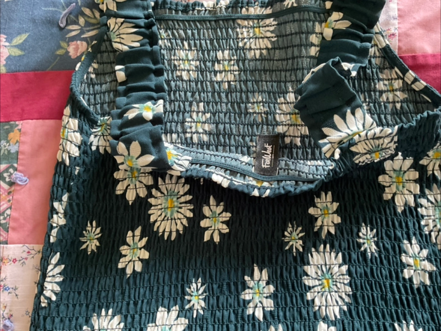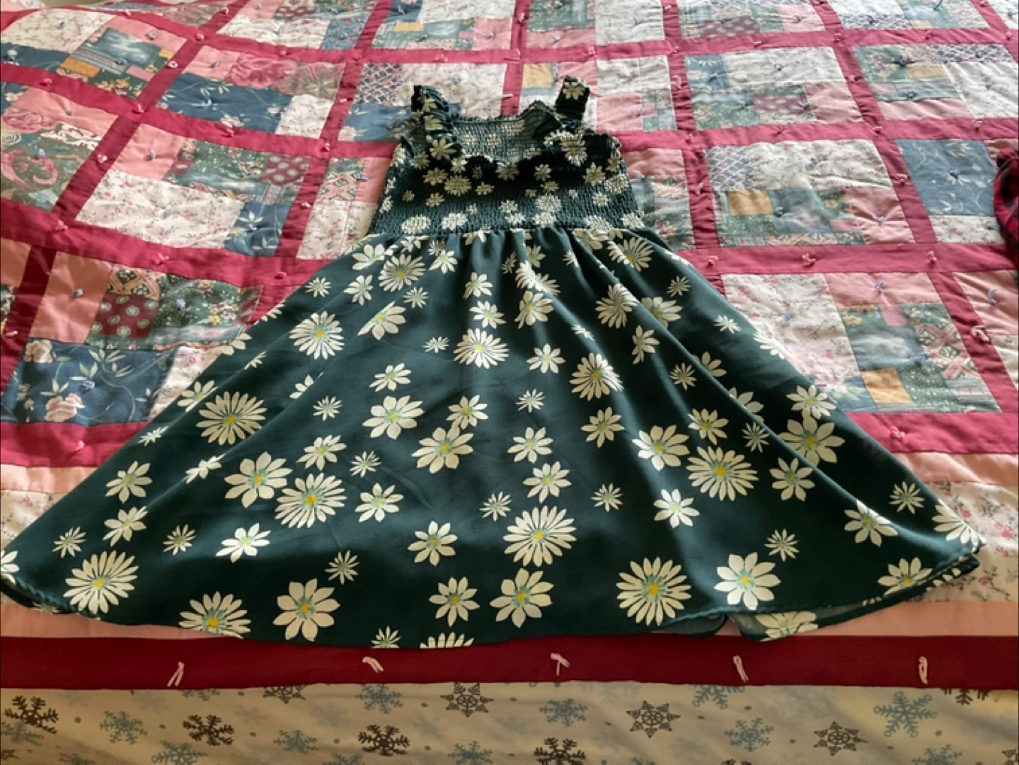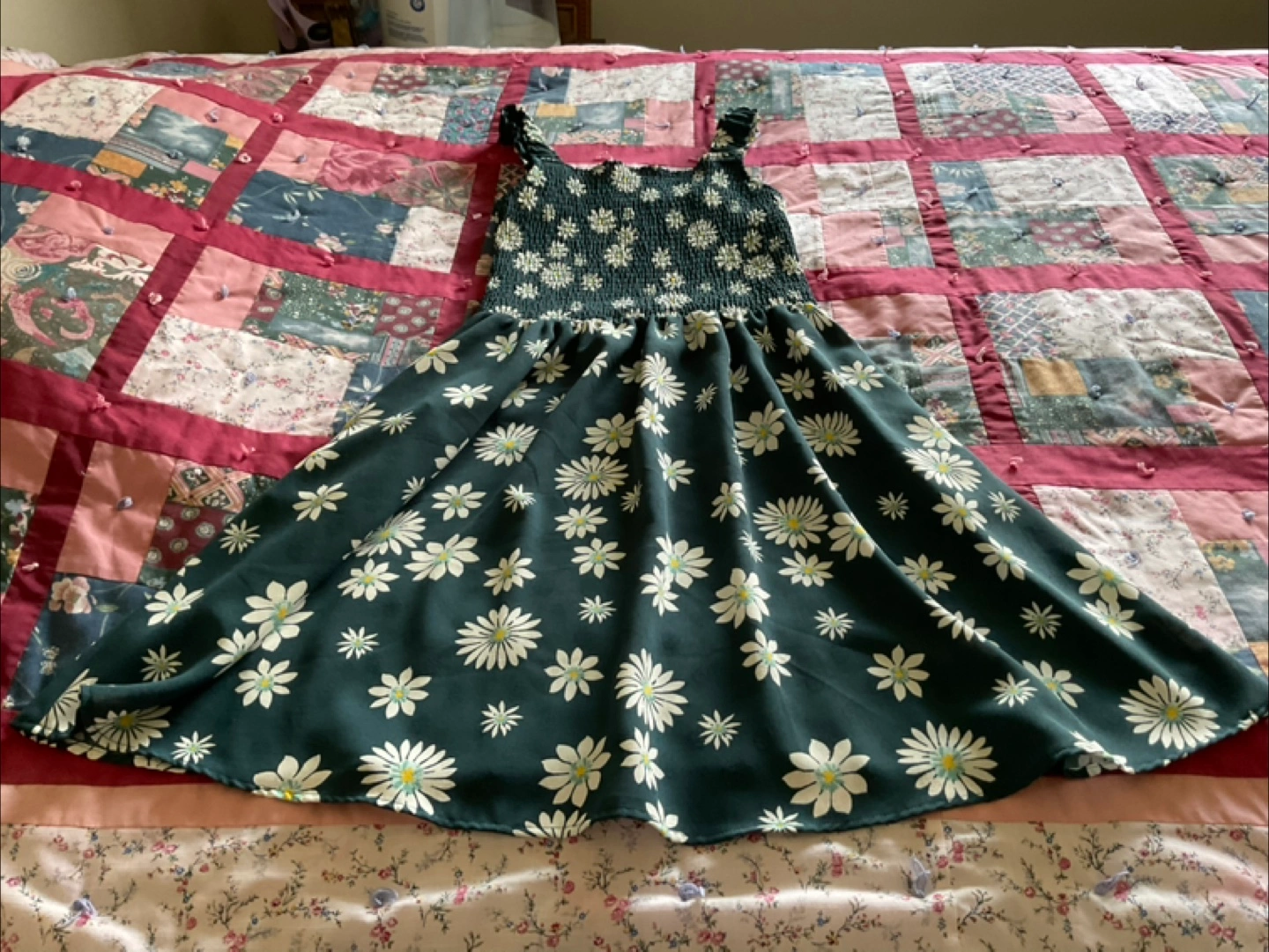 A dark dress with white daisy print. It has an elasticated bodice and wide straps. A wonderful piece for a summer stroll. Only worn once. It is too small for me. Really cute summer dress.